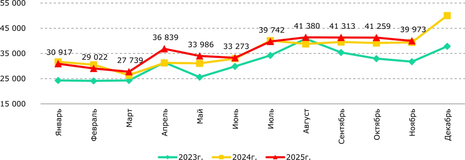 Рис. 3. Динамика количества сделок купли-продажи за 2023-2025 годы