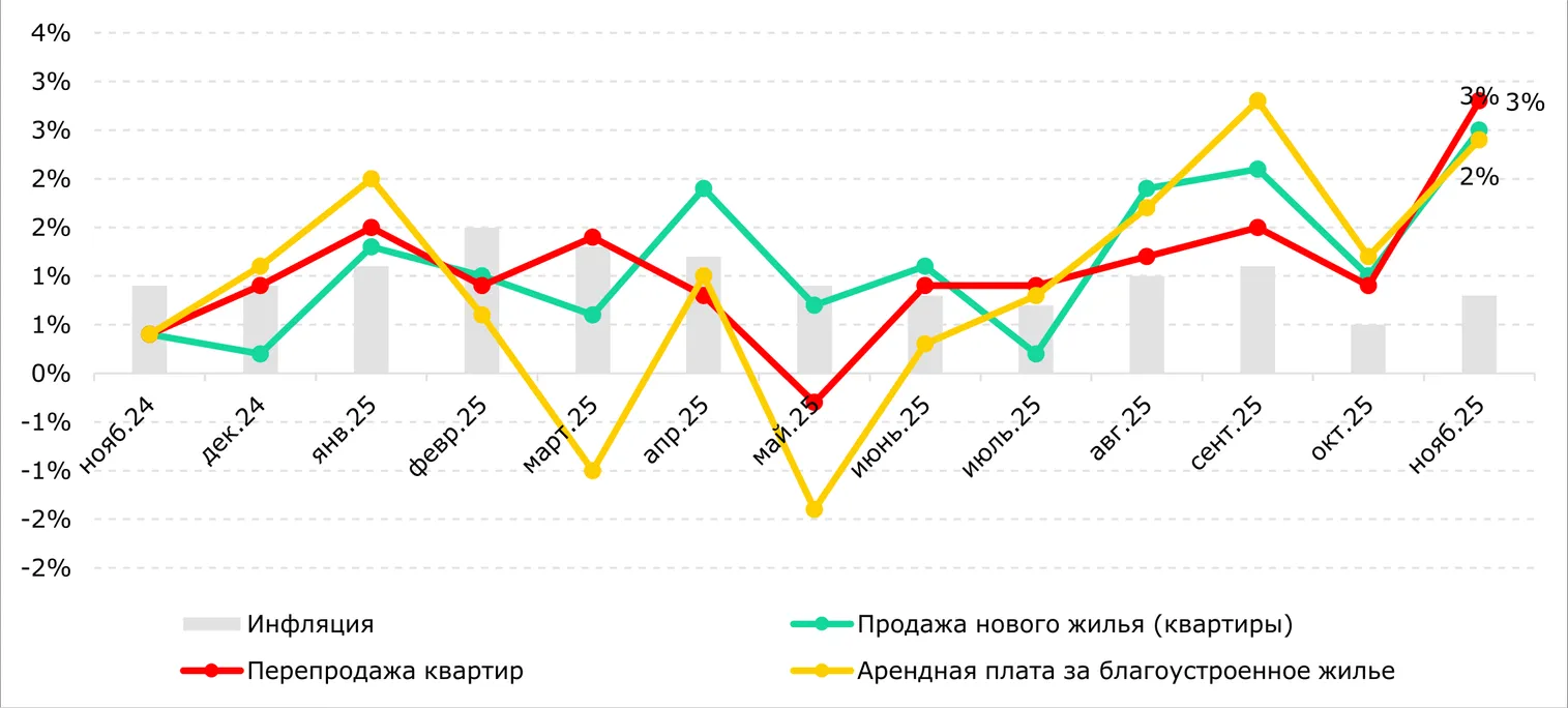 Продажи квартир уменьшились на 4,1% по сравнению с октябрем, при этом наибольшей популярностью второй месяц подряд пользовались двухкомнатные квартиры - заключено 11,9 тыс. сделок. Количество сделок по частным домам, наоборот, увеличилось на 0,4% по сравнению с предыдущим месяцев. В годовом выражении рынок демонстрирует умеренный рост: заключено на 1,4% больше сделок купли-продажи, чем в ноябре 2024 года. При этом наблюдается увеличение в количестве сделок за 11 месяцев 2025 года по сравнению с январем-ноябрем 2024 года на 3,3%.