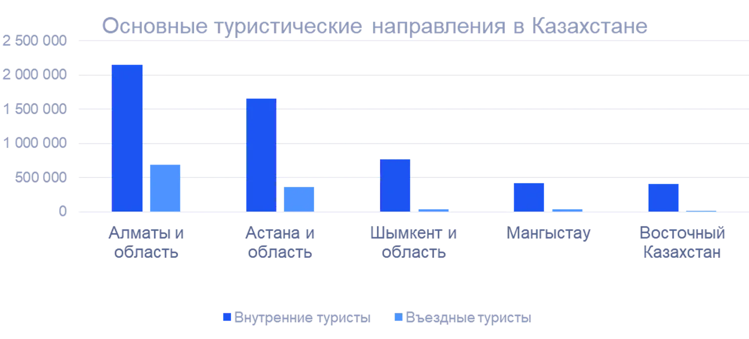 Основная часть общего туристического потока сконцентрирована в городах республиканского значения. Если рассматривать въездной туризм отдельно, то есть поток иностранных гостей, то их количество значительно выше в Алматы и Астане.