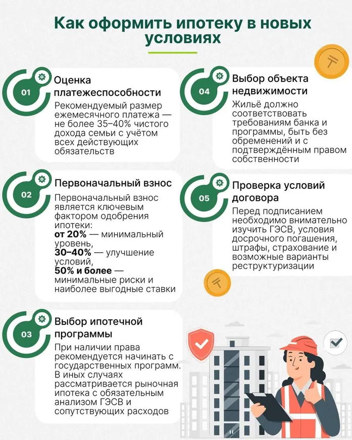 В наступившем году ипотека станет более «справедливой» и прозрачной: банки будут учитывать возможности заемщиков, государство помогать льготными программами, а ставки рассчитываться по новым правилам. Главное — планировать платежи заранее и иметь хотя бы небольшой первоначальный взнос. В Fingramota.kz рассказали об изменениях по ставкам ипотечных кредитов, новых правилах защиты заемщиков, важности размера первоначального взноса и других значимых нюансах.