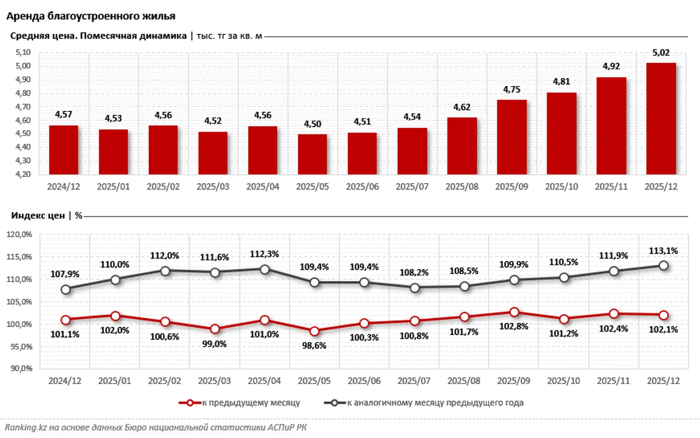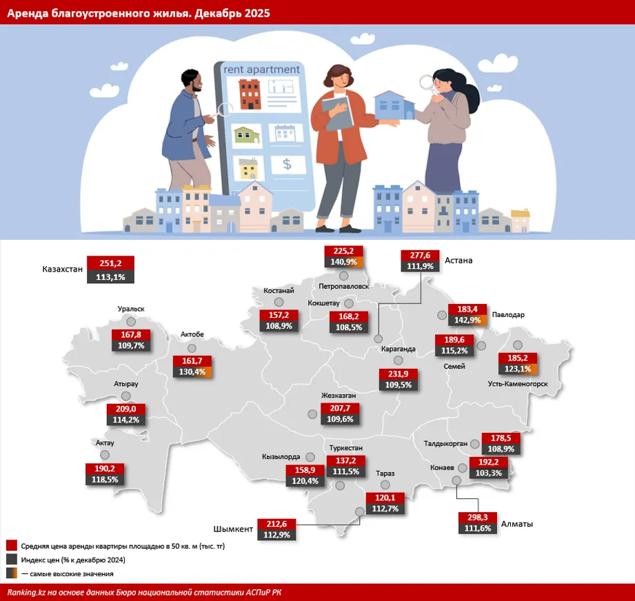 Помесячная динамика данных свидетельствует о том, что с января по август 2025 года стоимость арендного жилья варьировалась в пределах 4,5–4,6 тыс. тенге за кв. м. С начала осени наблюдался постепенный рост цен, который и дал по итогам декабря рекордно высокие показатели. Эту динамику можно проследить и по индексу цен. Именно в начале делового сезона спокойные значения динамики на уровне 0,8–1% перешли к росту на 2,8% за месяц.