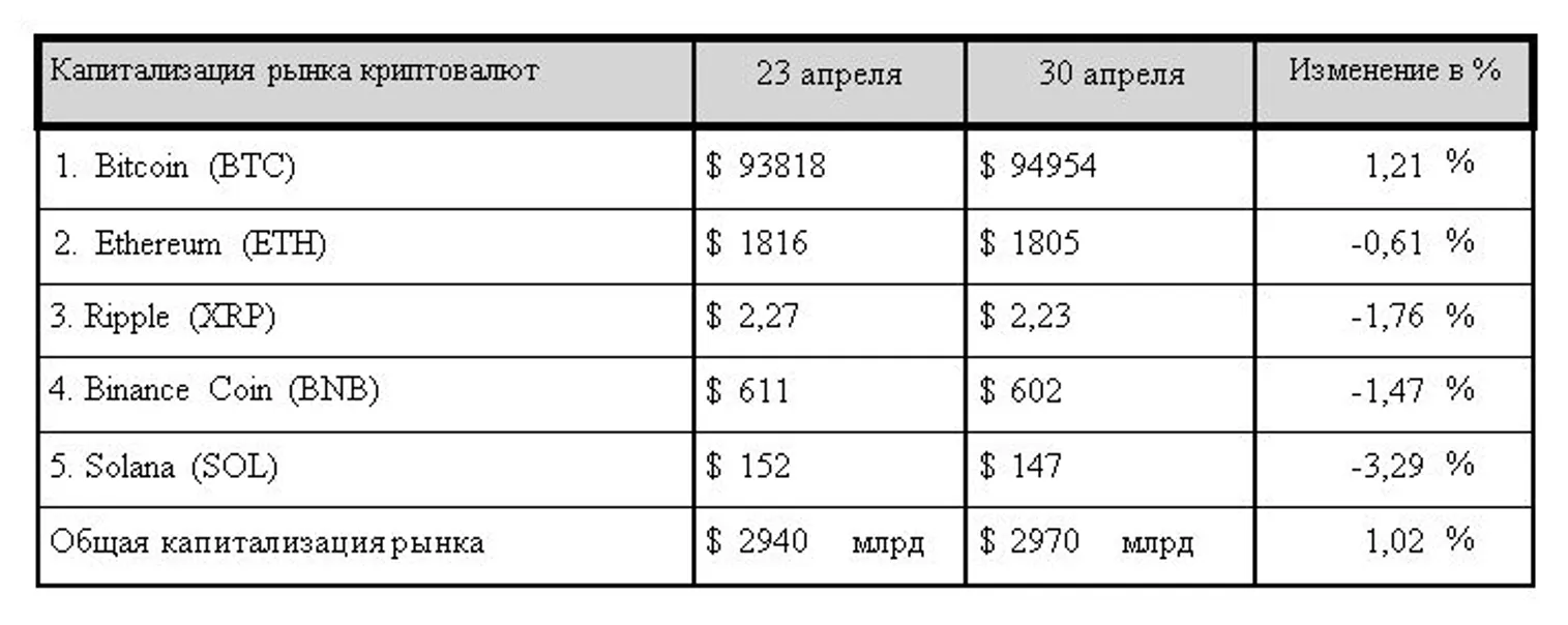 По итогам минувшего семидневного отчетного периода общая капитализация криптовалютного рынка немного увеличилась, и вплотную приблизилась к психологической отметке в $3 млрд. На вечер среды, 30 апреля 2025 года, она составила $2,97 трлн, что на 1,02% выше значений, зафиксированных на конец прошлого отчетного периода.