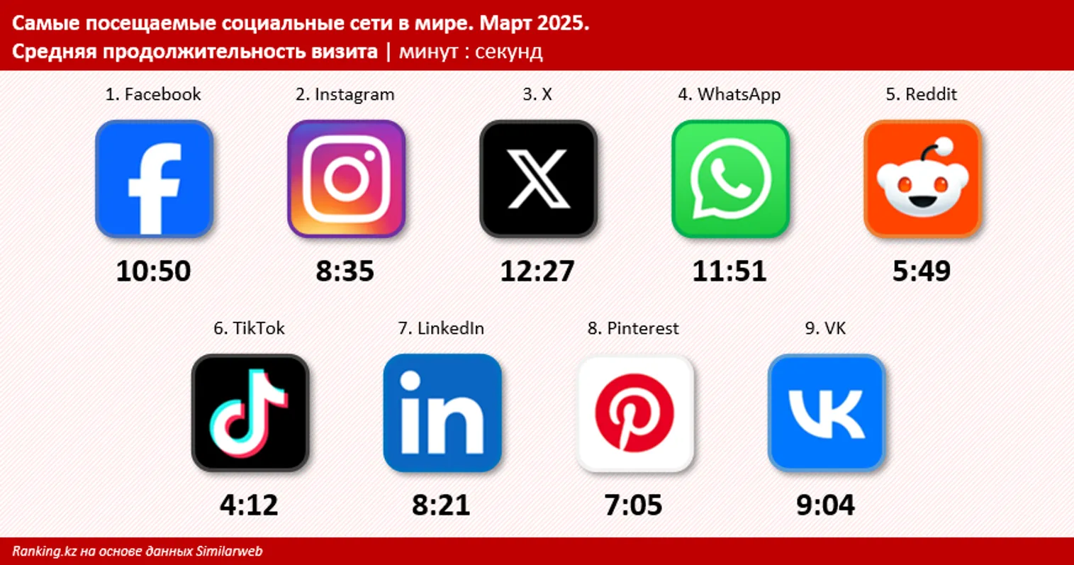 Всего в топ-50 самых посещаемых сайтов вошли 9 социальных сетей. Лидирует, как мы уже упоминали, Facebook, следом идут Instagram, X, WhatsApp, Reddit, TikTok, LinkedIn, Pinterest и VK. Наибольшая средняя продолжительность визита — у X (12 минут 27 секунд), WhatsApp (11 минут 51 секунда) и Facebook (10 минут 50 секунд), наименьшая — у TikTok (лишь 4 минуты 12 секунд).