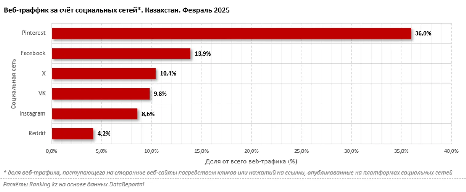 Социальной сетью, которая генерирует больше всего трафика в Казахстане, является Pinterest: на эту соцсеть приходится 36% веб-трафика, поступающего на сторонние сайты посредством кликов или нажатий на ссылки, опубликованных на платформе социальной сети. Следом идут Facebook (13,9%), X (10,4%), VK (9,8%), Instagram (8,6%) и Reddit (4,2%).