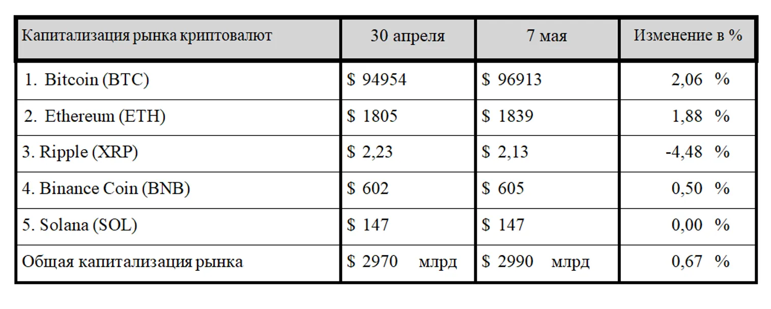 По итогам минувшего семидневного отчетного периода общая капитализация криптовалютного рынка немного увеличилась и вплотную застыла у психологической отметки $3 млрд. На вечер среды, 7 мая 2025 года, она составила $2,99 трлн, что на 0,67% выше значений, зафиксированных на конец прошлого отчетного периода.