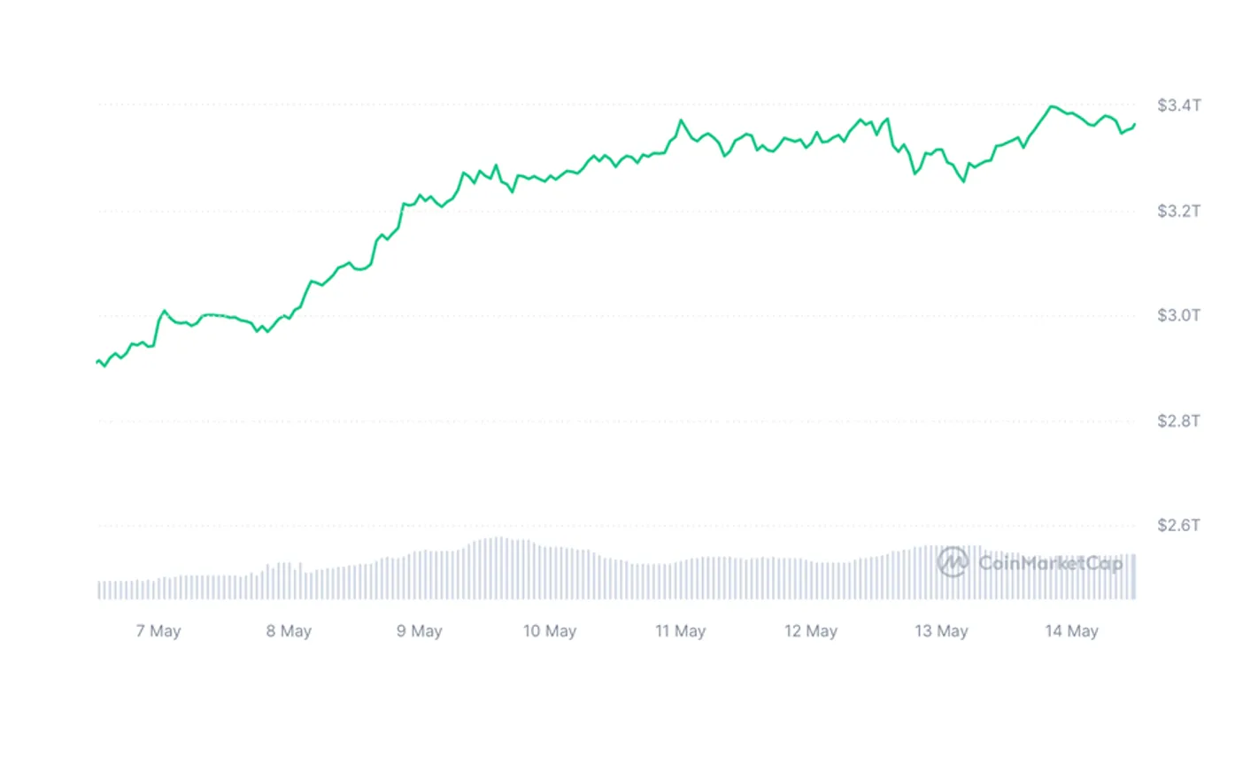 По итогам минувшего семидневного отчетного периода общая капитализация криптовалютного рынка увеличилась и наконец-то преодолела психологическую отметку $3 млрд. На вечер среды, 14 мая 2025 года, она составила $3,36 трлн, что на 12,37% выше значений, зафиксированных на конец прошлого семидневного отчетного периода.