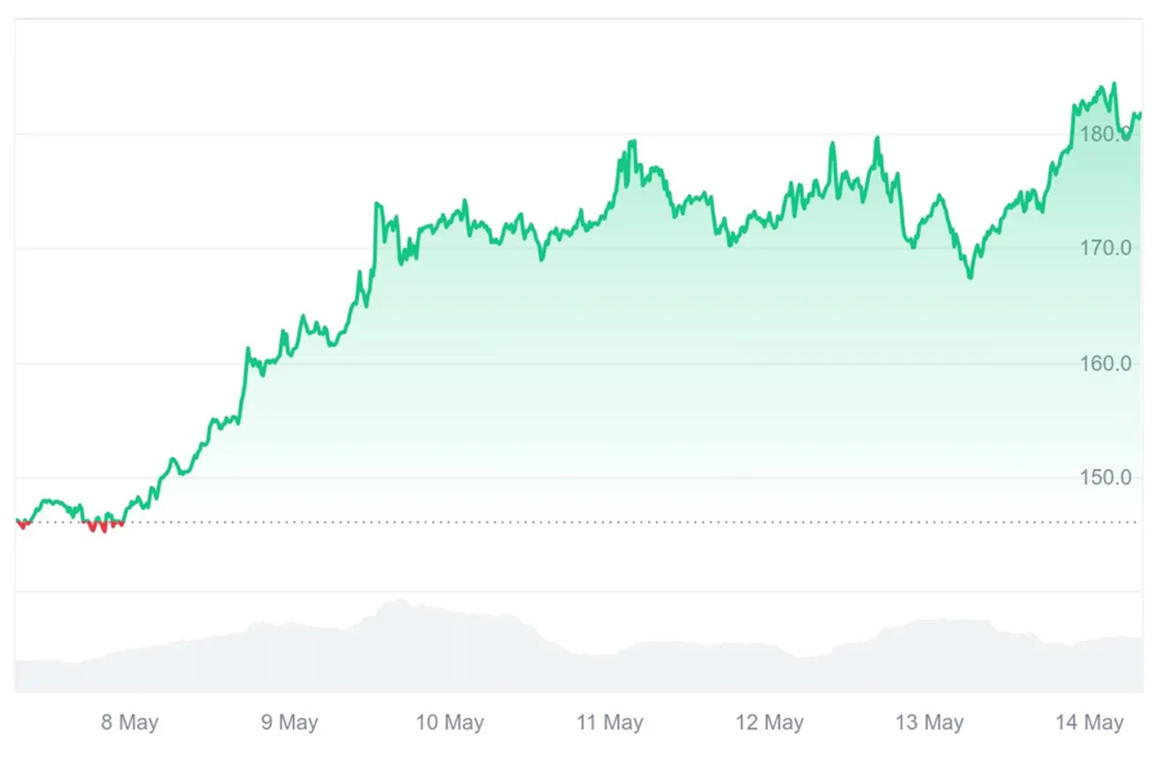 На вечер среды, 14 мая, Solana (SOL) зафиксировалась на отметке $180,77, показав изменения в цене за неделю на уровне Ethereum (+22,97%). Благодаря росту цены доля Solana на рынке немного увеличилась - с 2,55% до 2,75% (+0,2 п.п.), что делает этот цифровой актив претендентом на 4 место в рейтинге..