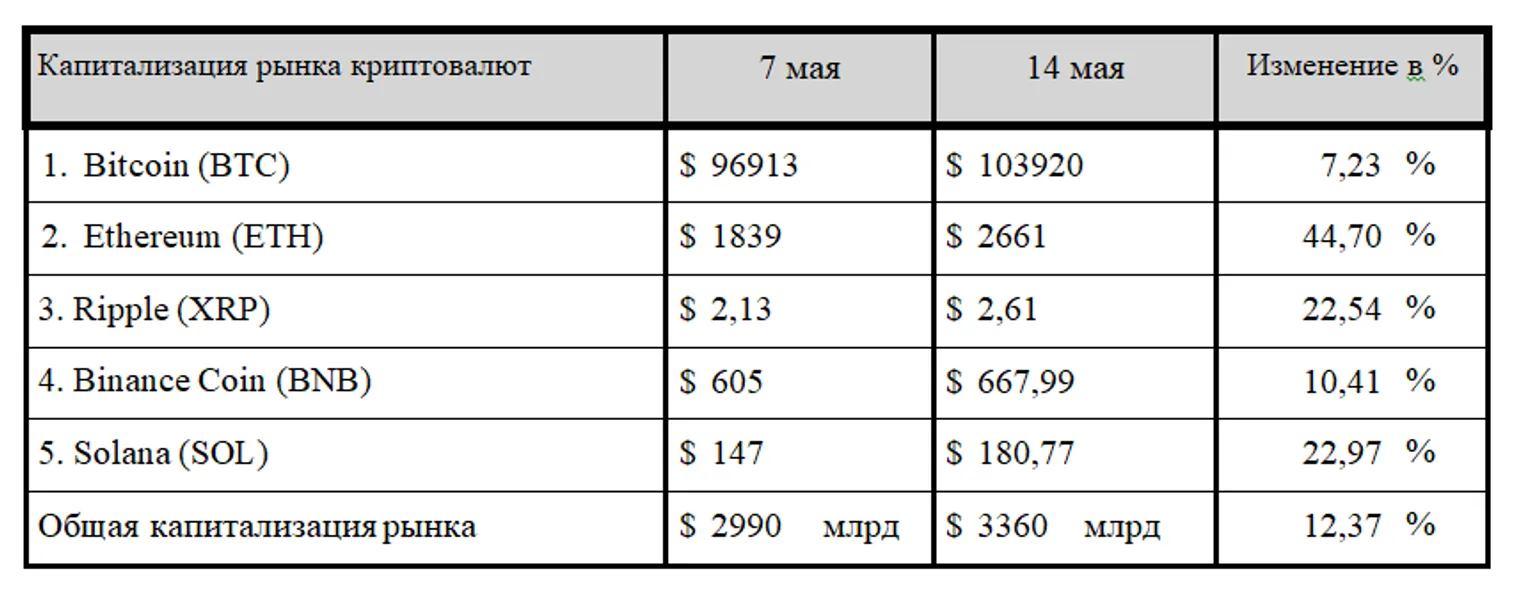 Таблица 1. Сравнение изменения стоимости Топ-5 криптовалют за неделю с 7 по 14 мая 2025 года