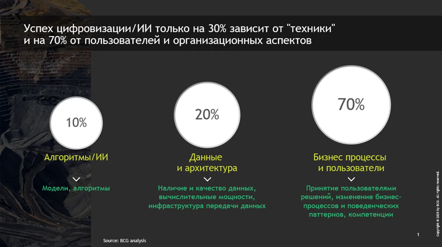 Интерес к ИИ со стороны глобального бизнеса продолжает расти. Так, согласно исследованию BCG IT Spending Pulse (2024), инвестиции в генеративный ИИ вырастут на 60% в течение ближайших трех лет. Однако, несмотря на то что дискуссия о цифровизации в горно-металлургическом комплексе продолжается уже около 10 лет, ее практическая реализация часто обусловлена необходимостью интеграции новых решений в уже функционирующие производственные процессы и системы. Это означает необходимость в обеспечении баланса между поддержанием текущего уровня эффективности одновременно с внедрением прорывных технологий.