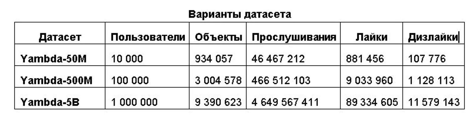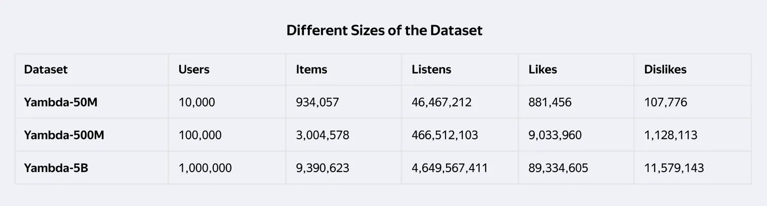 Датасет Yambda доступен в трёх вариантах (~5 млрд, 500 млн и 50 млн событий) и подходит для любых вычислительных мощностей и разных задач в области исследований и разработки.
