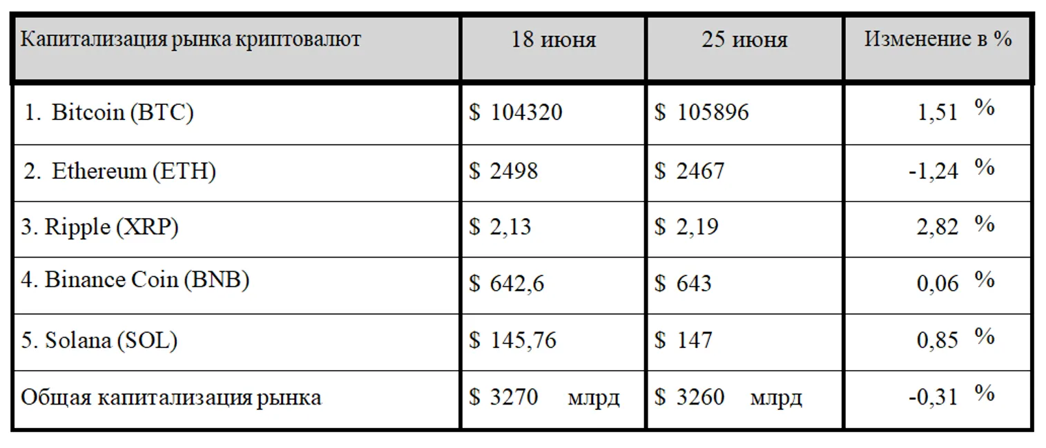 1. Bitcoin (BTC). На вечер среды, 25 июня, курс биткоина поднялся до $105896, прибавив за семь дней 1,51%. Капитализация BTC достигла $2,101 трлн, а его доля на рынке выросла с 63,96% до 64,30% (+0,34 п.п.). Первая криптовалюта быстро отыграла внезапное падение до $101000, спровоцированное эскалацией конфликта на Ближнем Востоке, и уже 24 июня закрепилась выше психологически важной отметки $105000. Дополнительную поддержку оказали продолжающиеся рекордные притоки в спотовые биткоин-ETF и ожидания, что институциональные закупки станут долгосрочным драйвером роста.