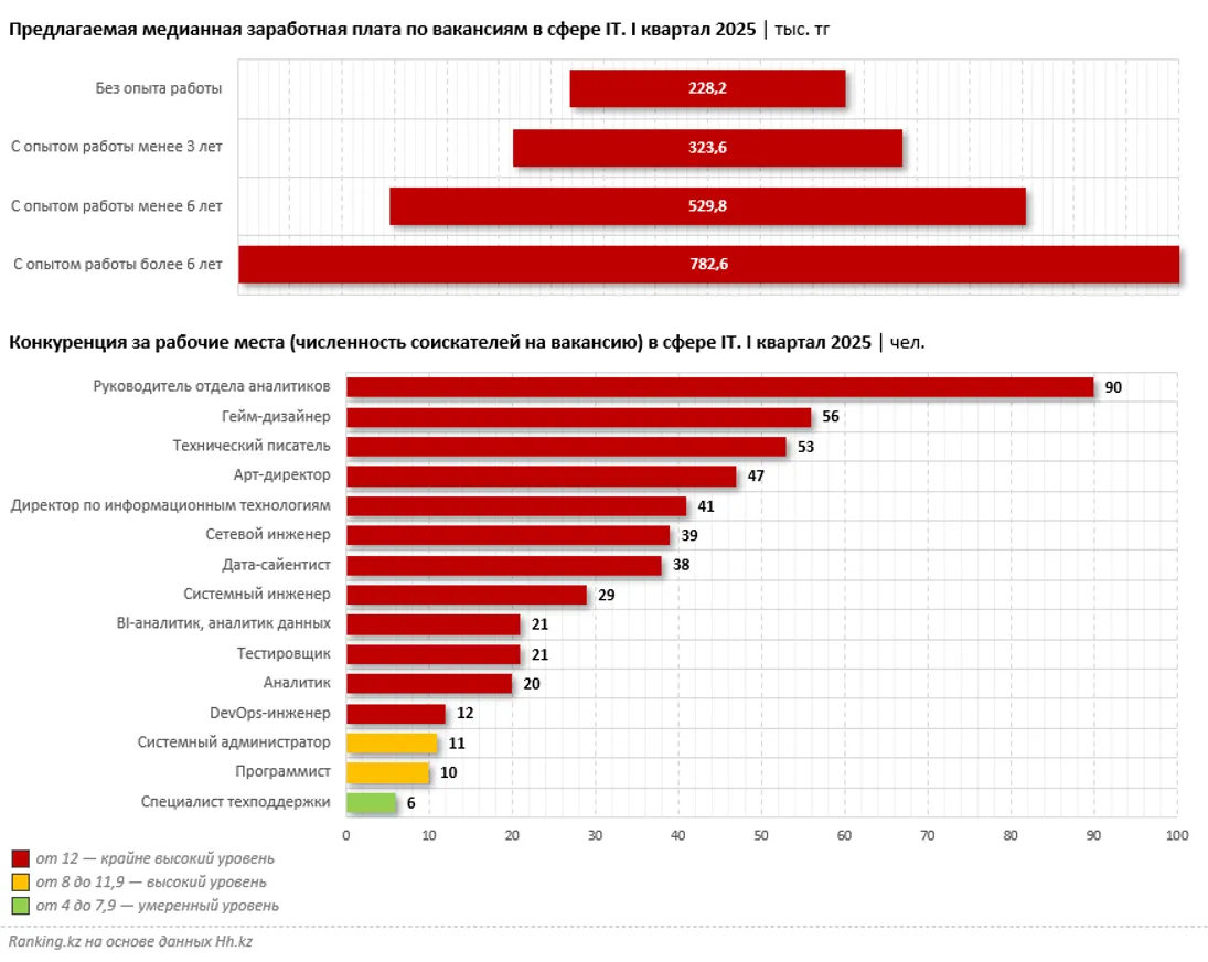 Конкуренция на рынке труда в этой сфере крайне высокая. Если средний индекс конкуренции по всем отраслям экономики на площадке Hh.kz составляет 7,4, то для многих профессий в секторе IT этот индикатор превышает 12. Максимальный индекс конкуренции в первом квартале 2025-го наблюдался среди руководителей отделов аналитиков: 90 человек на место. Программисты как рабочие единицы отрасли тоже конкурируют за рабочие места, однако их соперничество уже не такое острое: 10 соискателей на вакансию.