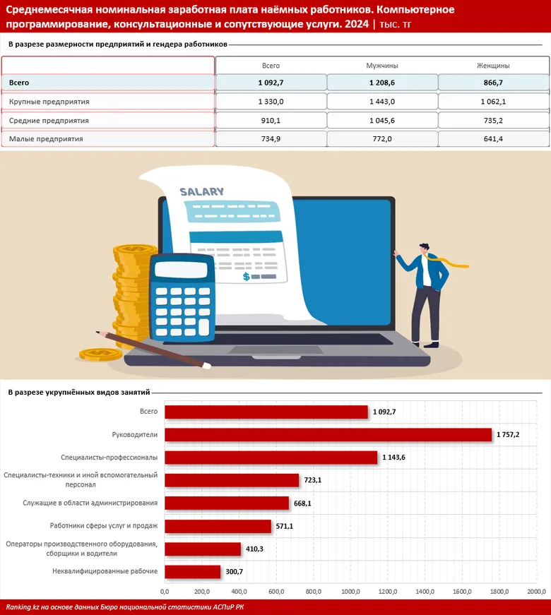 Детализированные данные БНС о зарплатах по профессиям в IT-сфере позволяют заметить большой разрыв между руководителями, специалистами статуса senior и сотрудниками первого уровня. Например, бизнес-аналитик в ИКТ в прошлом году в РК мог зарабатывать 2,7 млн тенге, а оператор call-центра по поддержке пользователей — 318,9 тыс. тенге.