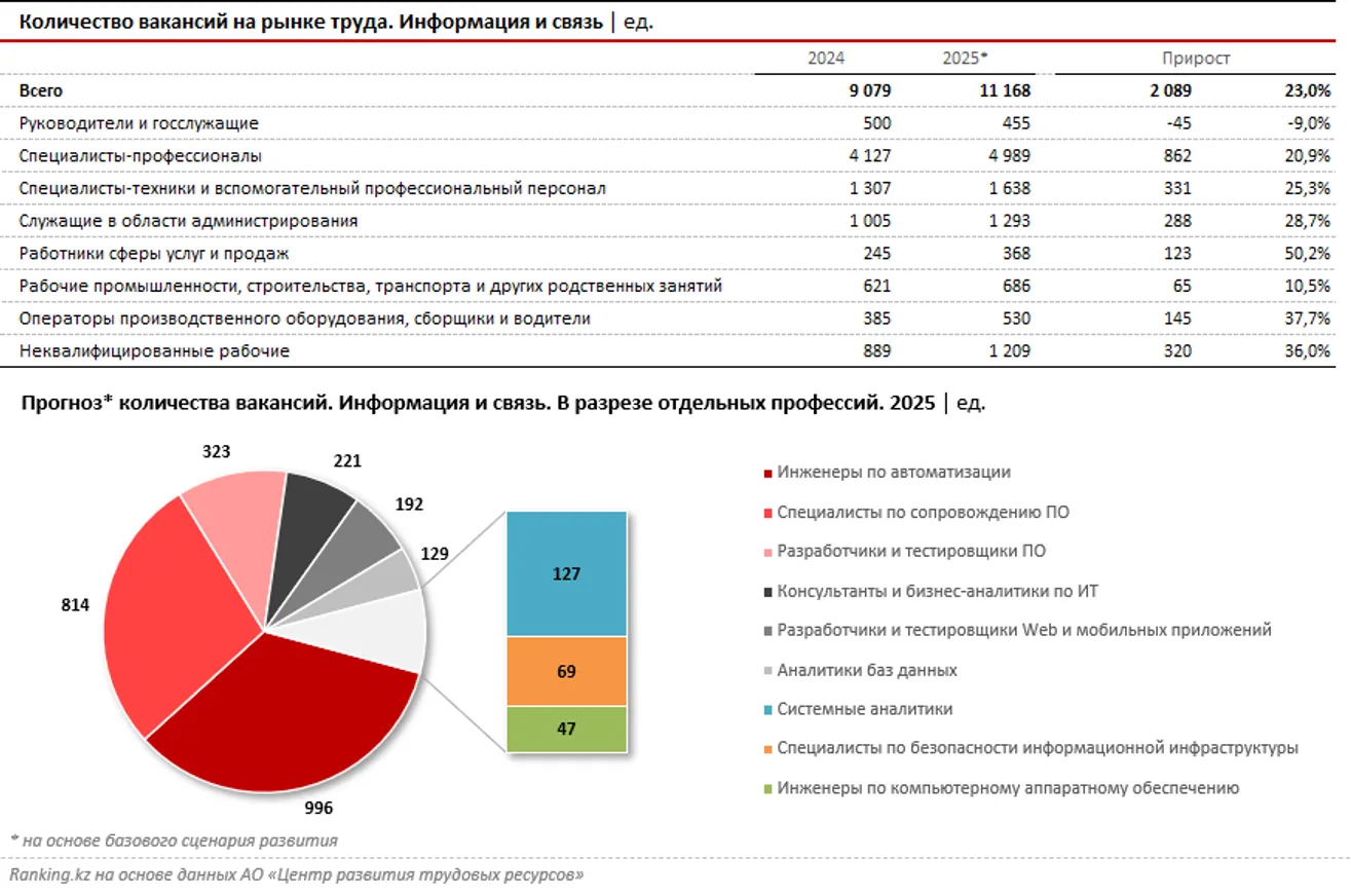 В анализе рынка труда в сфере информации и связи, который провели специалисты АО «Центр развития трудовых ресурсов», указывается, больше всего в секторе востребованы специалисты-профессионалы — программисты, разработчики, дизайнеры и т. д. В прошлом году доля таких вакансий в отрасли составила 45,5%, или 4,1 тыс. единиц. На втором месте по востребованности оказались специалисты-техники и вспомогательный персонал: 1,3 тыс. вакансий. В остальных категориях объявлений о найме сотрудников было намного меньше.