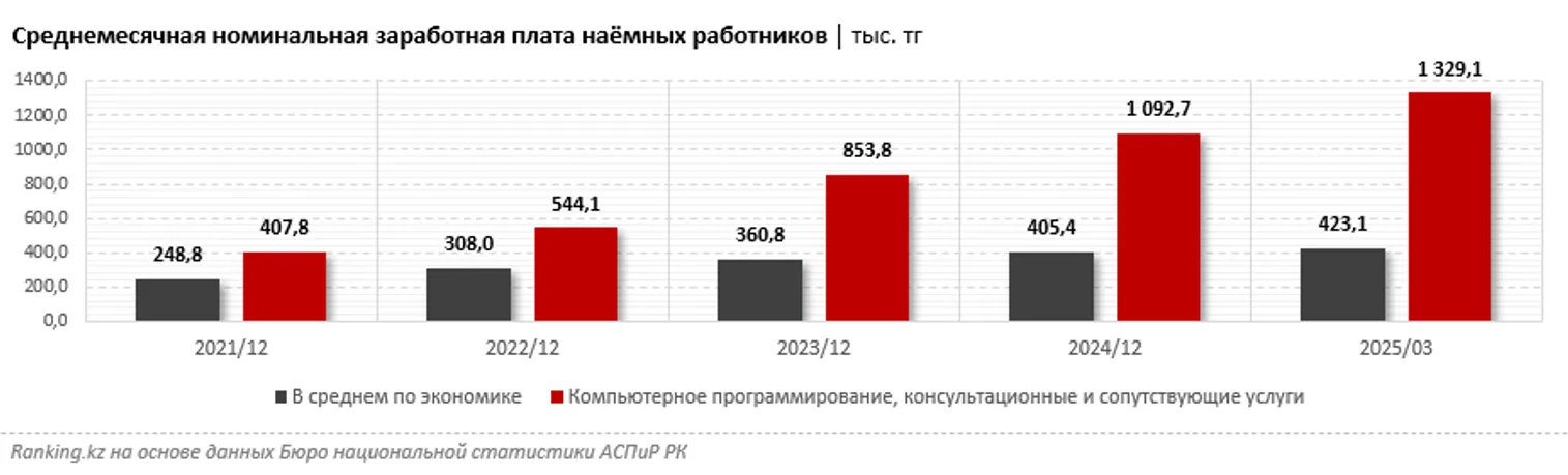 Номинальная заработная плата в категории «Компьютерное программирование, консультационные и сопутствующие услуги» в первом квартале текущего года была одной из самых высоких в стране: 1,3 млн тенге. Выше зарплаты были только у финансистов. Номинальная заработная плата в IT-категории в 3,1 раза больше, чем в среднем по экономике (423,1 тыс. тенге). Такая огромная разница — тоже своеобразный рекорд. В 2021–2023 годах зарплаты программистов, разработчиков и прочих подобных специалистов тоже превышали среднереспубликанские показатели, однако разрыв был меньше.