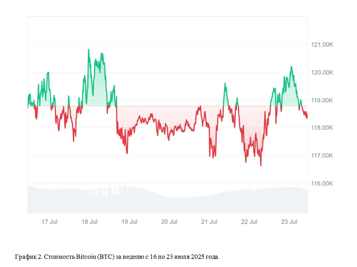 На вечер среды, 23 июля, курс биткоина зафиксировался на отметке 118 тыс. 158 долларов, потеряв за неделю незаметные 0,04%. Капитализация первой криптовалюты составила 2346 млрд долларов, а сам актив уверенно удержался около отметки 118 тыс. долларов, продемонстрировав существенную поддержку на этом уровне. При этом доля BTC в совокупной капитализации снизилась с 62,98% до 60%, что свидетельствует об ускорившемся перетоке части средств в другие цифровые активы.