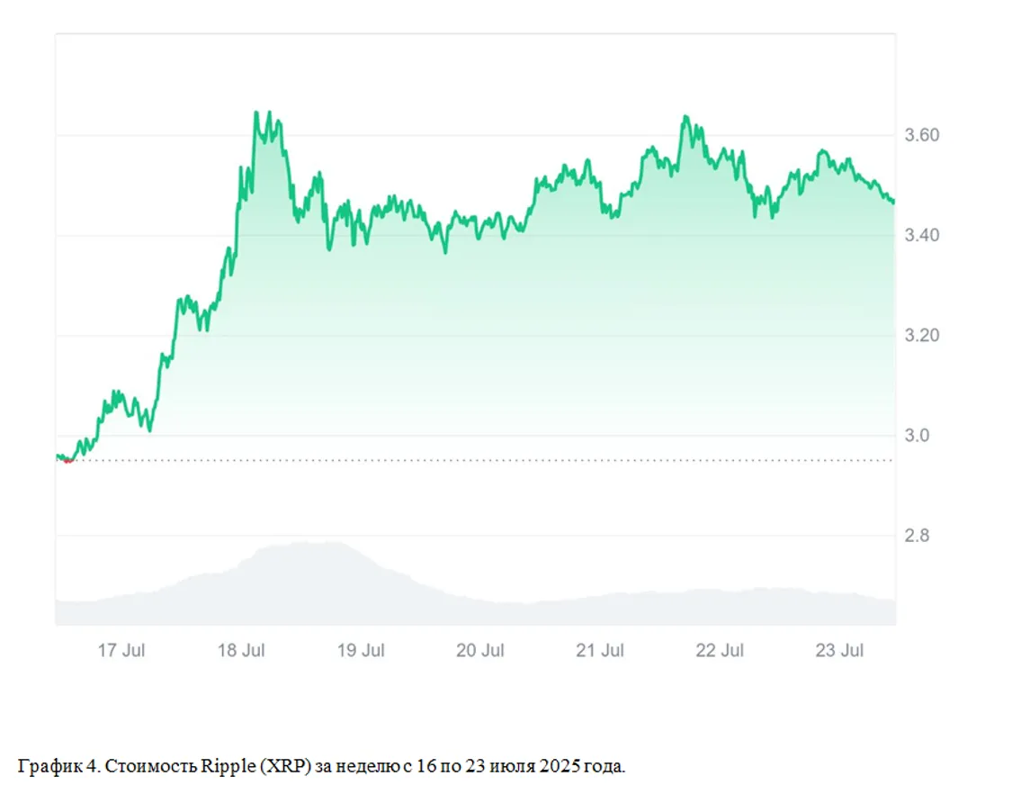 На вечер среды, 23 июля, курс XRP достиг 3,47 доллара, подскочив за неделю на 17,63%. Токен Ripple стремительно преодолел локальное сопротивление 3,40 доллара и консолидировался на новых максимумах благодаря позитивным ожиданиям вокруг внедрения блокчейн‑решений в банковском секторе и все тому же Genius Act. Доля XRP в общей капитализации возросла с 4,64% до 5,23%, укрепив позицию проекта в числе крупнейших криптовалют.