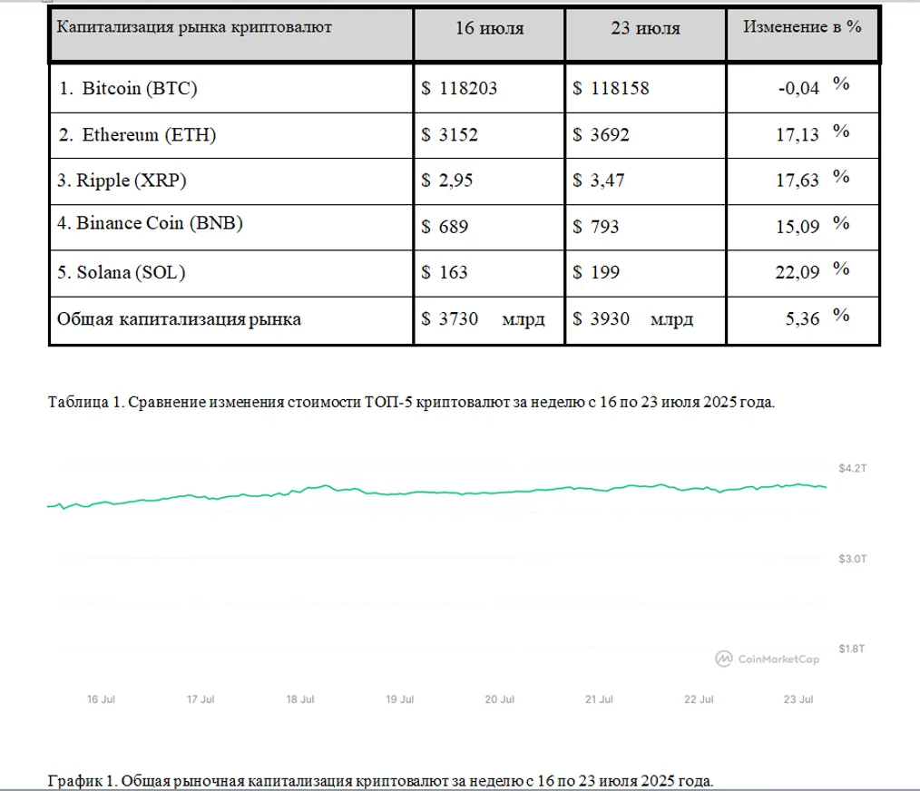 По итогам минувшего семидневного отчетного периода общая капитализация криптовалютного рынка уже который месяц приблизилась к психологической отметке 4 млрд долларов. Рост сопровождался активным притоком в альткоины, что снизило долю биткоина. Если текущие тенденции сохранятся, аналитики не исключают тест области 4,5 трлн долларов во второй половине лета. На вечер среды, 23 июля 2025 года, она составила 3,93 трлн долларов, что на 5,36% выше значений, зафиксированных на конец прошлого семидневного отчетного периода.