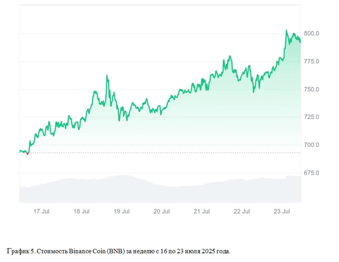 На 2026 год заявлен запуск «следующего поколения» BNB Chain: разработчики пообещали подтверждение транзакций менее чем за 150 миллисекунд, а производительность свыше 20 000 транзакций в секунду, встроенные функции конфиденциальности и интуитивно понятный интерфейс уровня Web2. Команда заверила, что новый этап сделает работу ончейн-приложений столь же удобной, как в привычных мобильных сервисах, сохранив при этом полный контроль над активами. Благоприятные ожидания и общая волна «альтсезона» подстегнули цену BNB. К середине недели монета уверенно преодолела 760 долларов, а 23 июля в ходе торгов в Азии обновила исторический максимум на уровне 800 долларов.