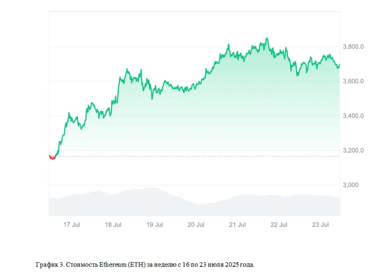 На вечер среды, 23 июля, стоимость эфира взлетела до 3 тыс. 692 долларов, показав внушительный недельный прирост 17,13%. В течение семи дней Ethereum уверенно преодолел психологический барьер 3 тыс. 500 долларов и закрепился выше, поддерживаемый принятым в США Genius Act и интересом институционалов. Рыночная доля ETH увеличилась с 10,19% до 11,3%, что подчеркивает его растущее значение среди альткоинов и сетей для стейблкоинов.