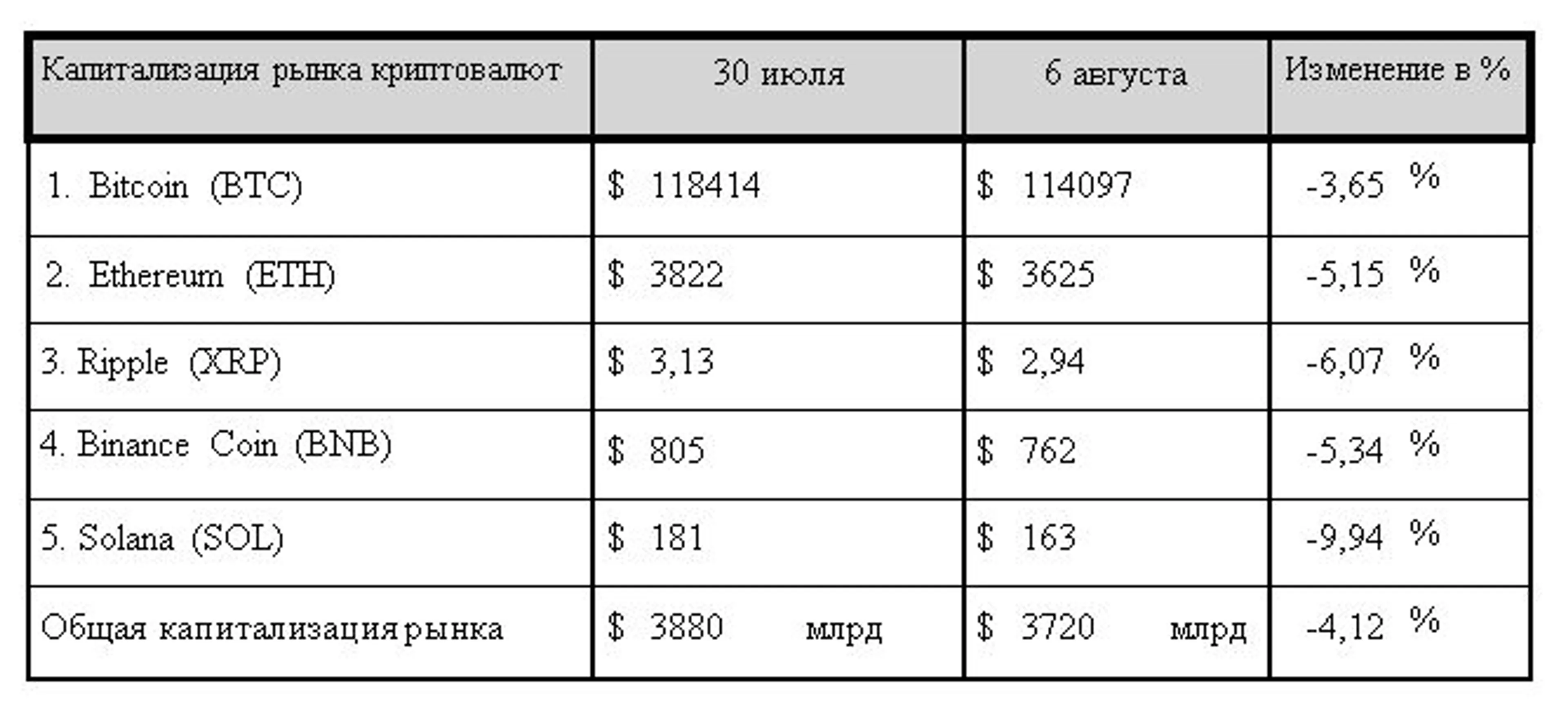 По итогам минувшего семидневного отчетного периода общая капитализация криптовалютного рынка немного отдалилась от важной психологической отметки $4 трлн. На вечер среды, 6 августа 2025 года, она составила $3,72 трлн, что на 4,12% ниже значений, зафиксированных на конец прошлого отчетного периода.