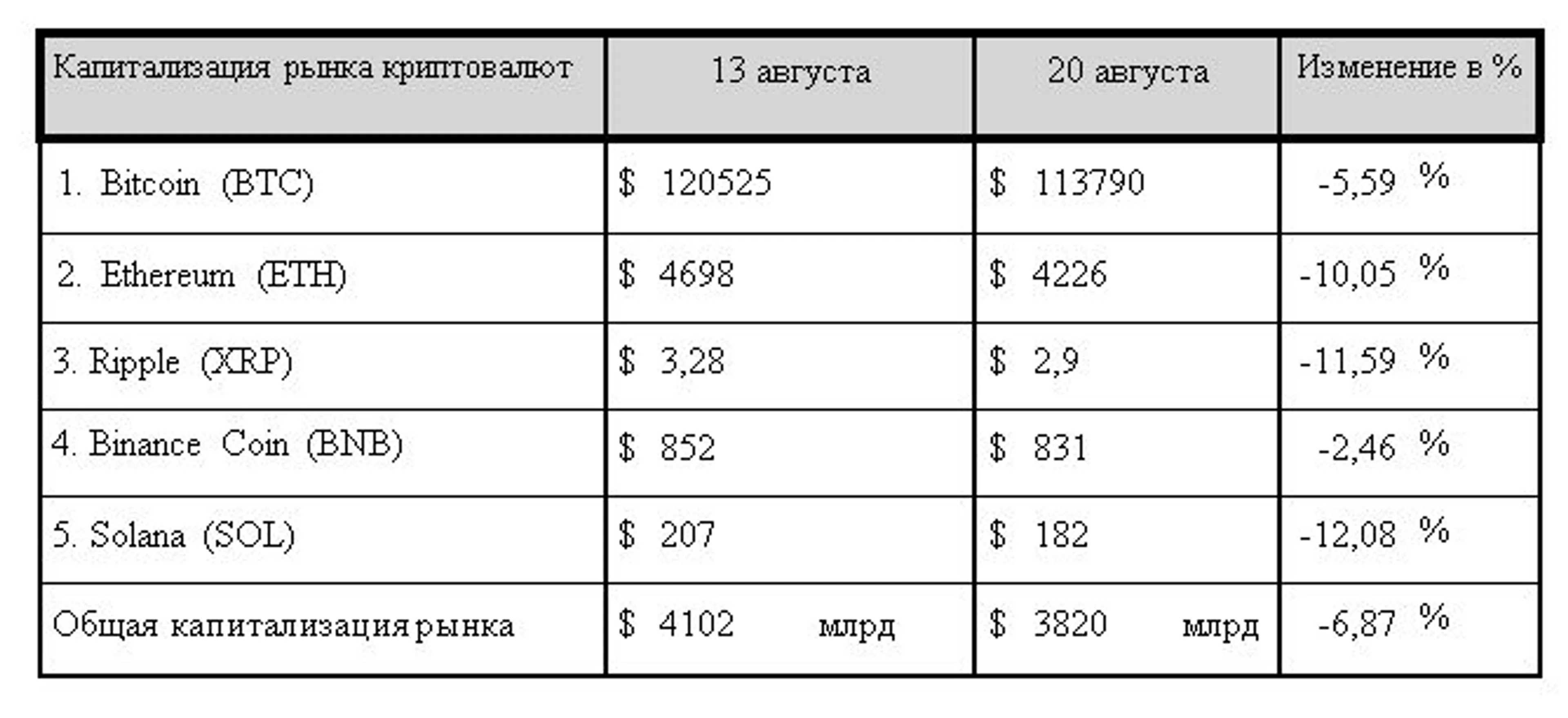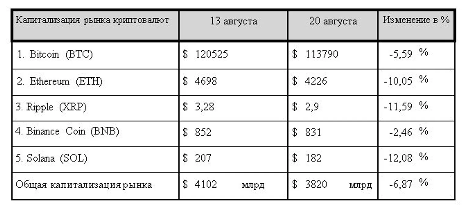 По итогам минувшего семидневного отчетного периода общая капитализация криптовалютного рынка провалила важную психологическую отметку $4 трлн. На вечер среды, 20 августа 2025 года, она составила $3,82 трлн, что на 6,87% ниже значений, зафиксированных на конец прошлого семидневного отчетного периода.