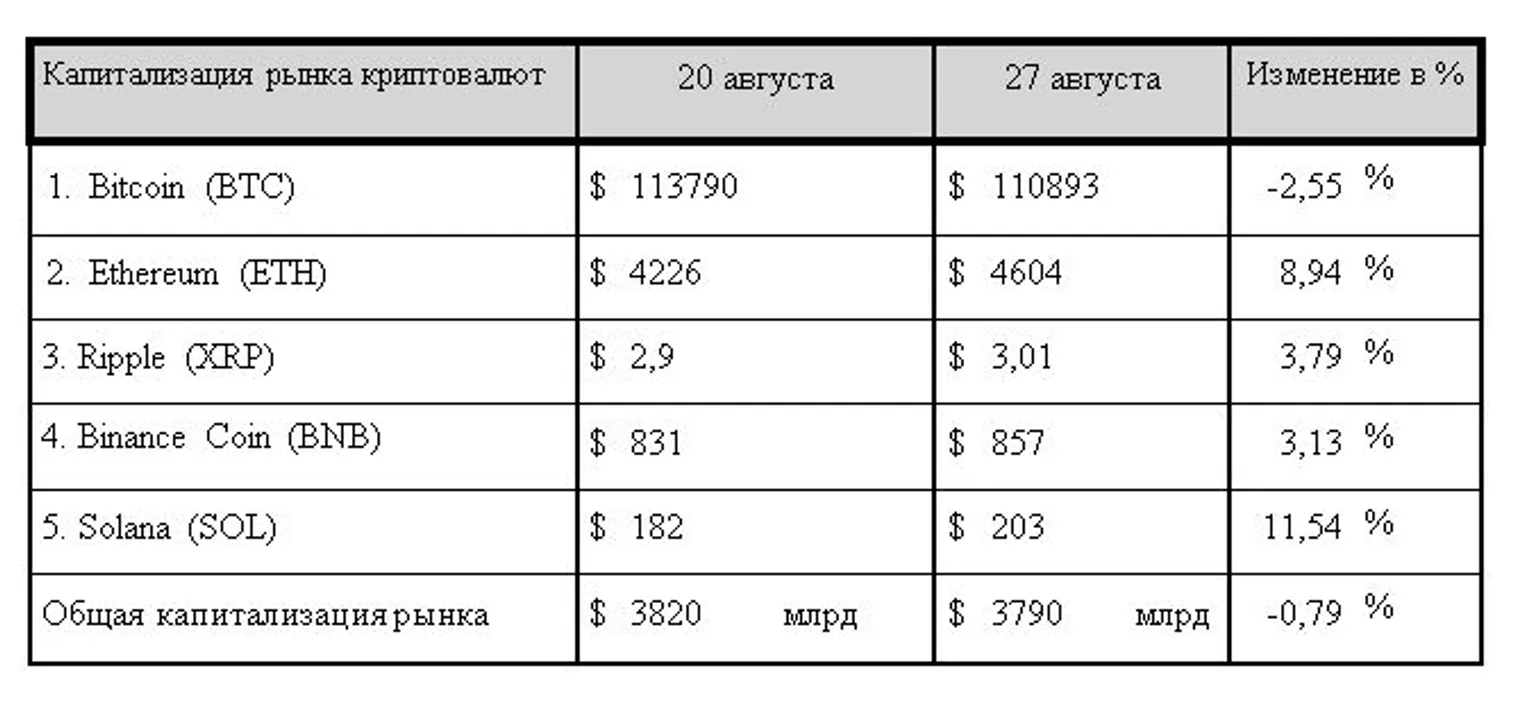 По итогам минувшего семидневного отчетного периода общая капитализация криптовалютного рынка не смогла отвоевать важную психологическую отметку в $4 трлн. На вечер среды, 27 августа 2025 года, она составила $3,78 трлн, что на 6,87% ниже значений, зафиксированных на конец прошлого отчетного периода.