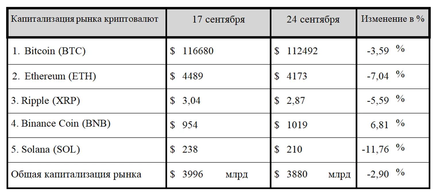 По итогам минувшего семидневного отчетного периода общая капитализация криптовалютного рынка немного сдала позиции и провалила психологическую отметку в $4 трлн. На вечер среды, 24 сентября 2025 года, она составила $3,88 трлн, что на 2,9% ниже значений, зафиксированных на конец прошлого отчетного периода.