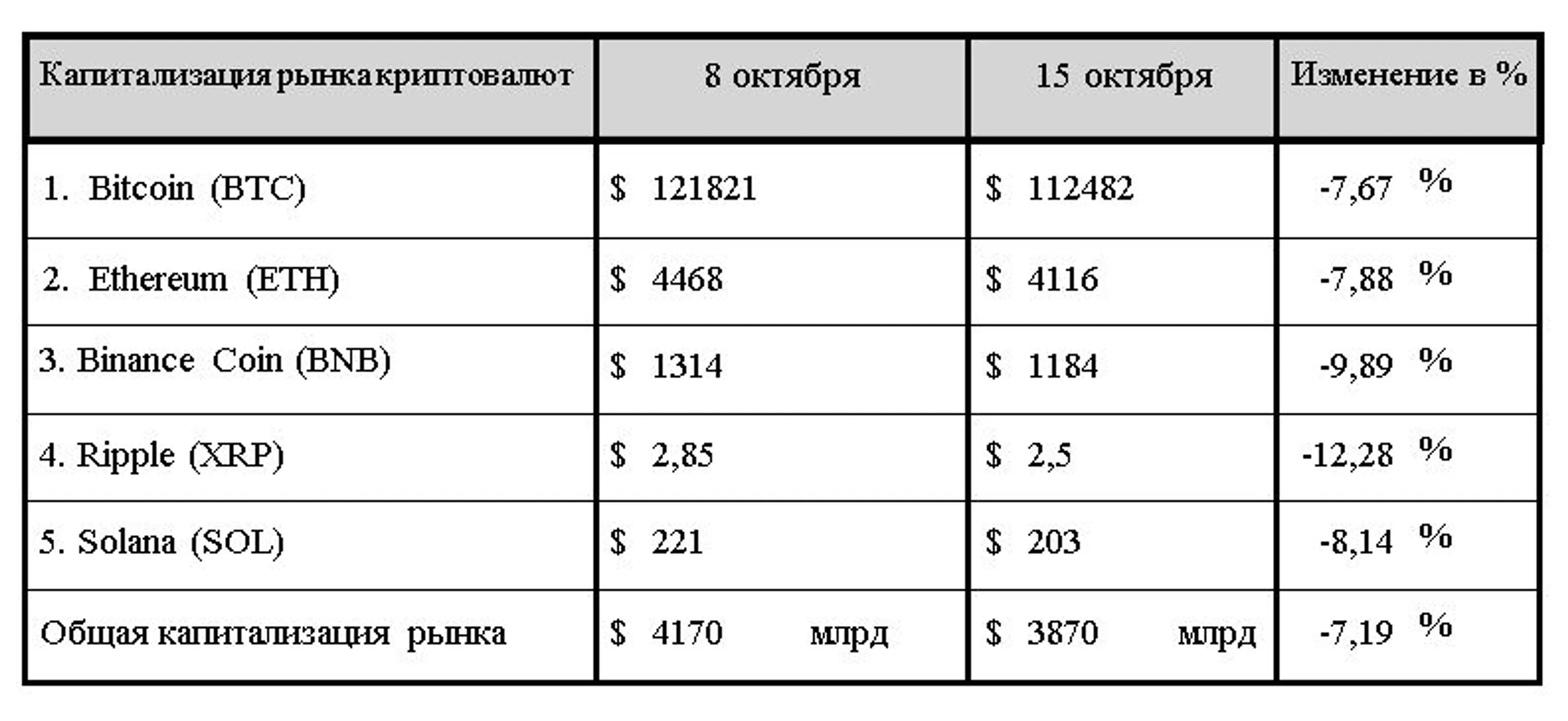 По итогам минувшего семидневного отчетного периода общая капитализация криптовалютного рынка провалила долго удерживаемую психологическую отметку в $4 трлн. На вечер среды, 15 октября 2025 года, она составила $3,87 трлн, что на 3,94% выше значений, зафиксированных на конец прошлого отчетного периода.