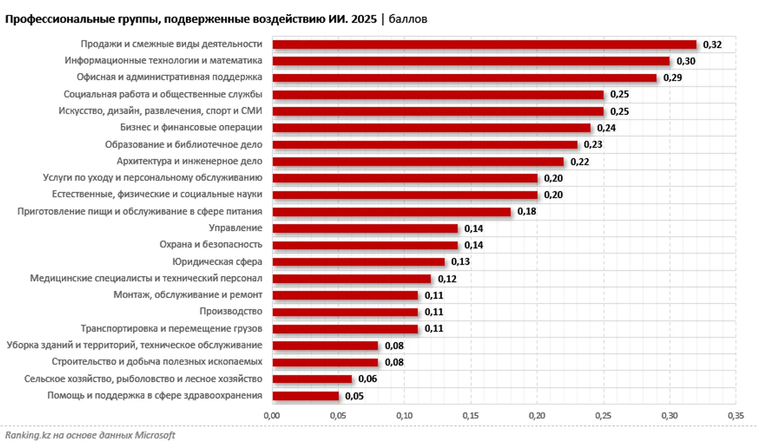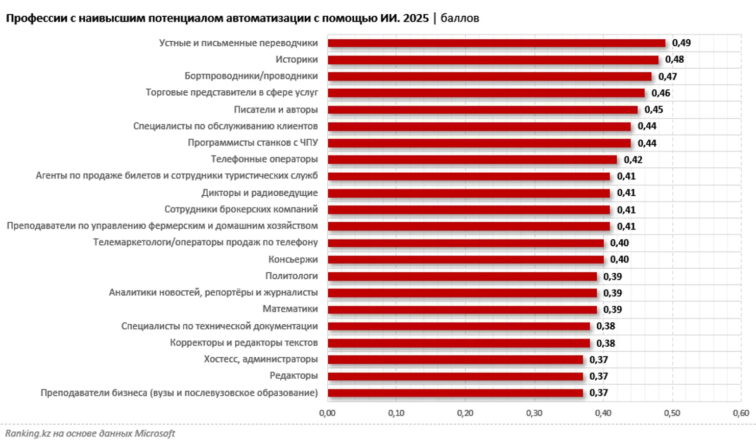 Искусственный интеллект всё активнее внедряется в рабочие процессы, от офисных задач до креативных профессий. По данным последнего исследования от Microsoft «Работа с ИИ: оценка применимости генеративного искусственного интеллекта к различным профессиям», уровень автоматизации стремительно растёт, а целые профессиональные группы уже частично заменяются алгоритмами. Наиболее заметные изменения наблюдаются в сферах, где большую часть задач можно формализовать и передать цифровым системам — от клиентского сервиса до медиа и административной поддержки, пишет ranking.kz.