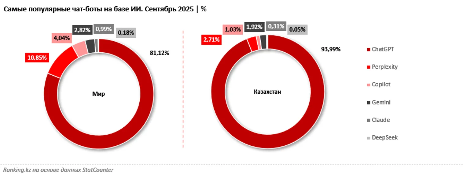 В Казахстане также лидирует ChatGPT, но с более внушительной долей на рынке в 93,99%. На втором месте также располагается Perplexity (2,71%), а замыкает тройку лидеров уже Gemini (1,92%). Следом идут Copilot (1,03%), Claude (0,31%) и DeepSeek (0,05%).
