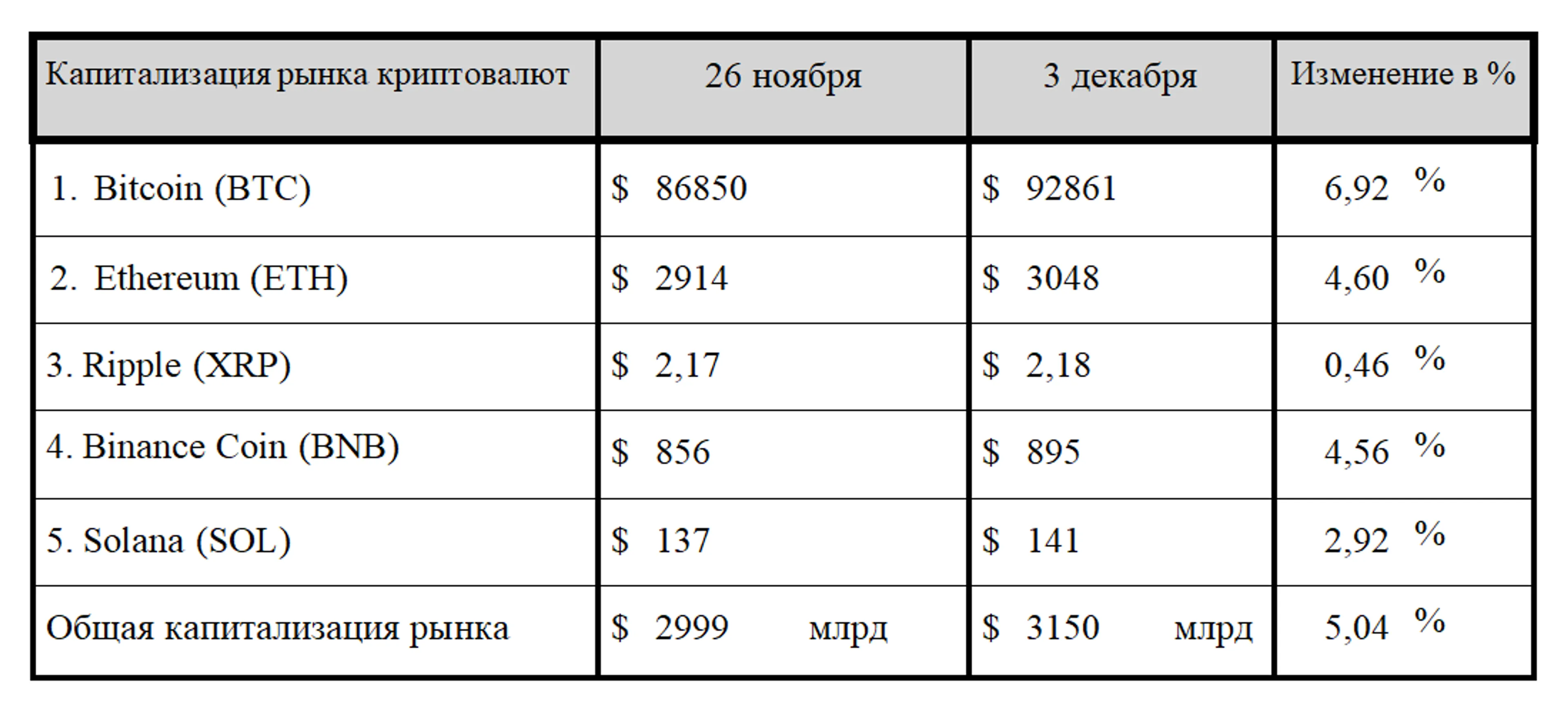 По итогам минувшего семидневного отчетного периода общая капитализация криптовалютного рынка поднялась выше критически важной отметки $3 трлн. На вечер среды, 3 декабря 2025 года, она составила $3,15 трлн, что на 5,04% выше значений, зафиксированных на конец прошлого отчетного периода.