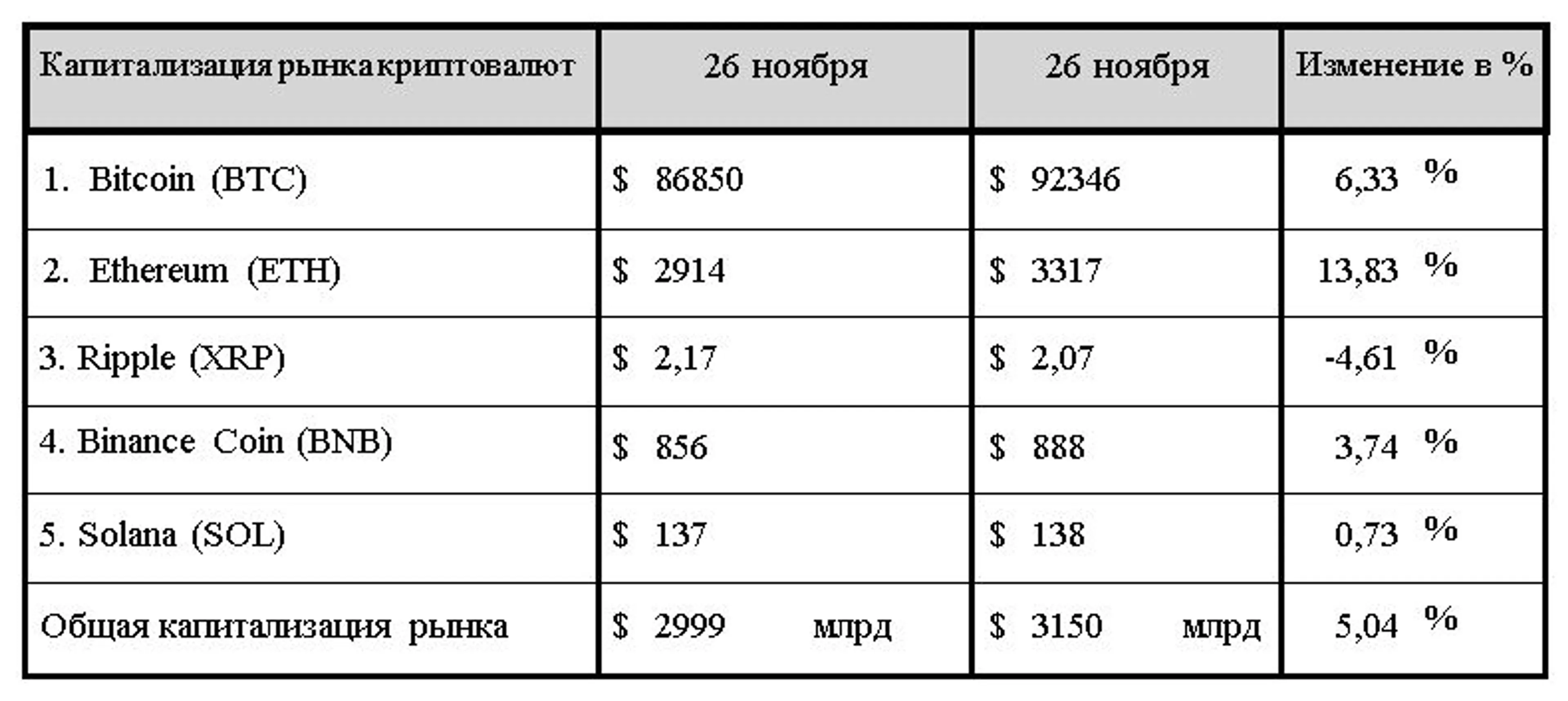 По итогам минувшего семидневного отчетного периода общая капитализация криптовалютного рынка поднялась выше критически важной отметки в $3 трлн. На вечер среды, 10 декабря 2025 года, она составила $3,15 трлн, что на 5,04% выше значений, зафиксированных на конец прошлого отчетного периода.