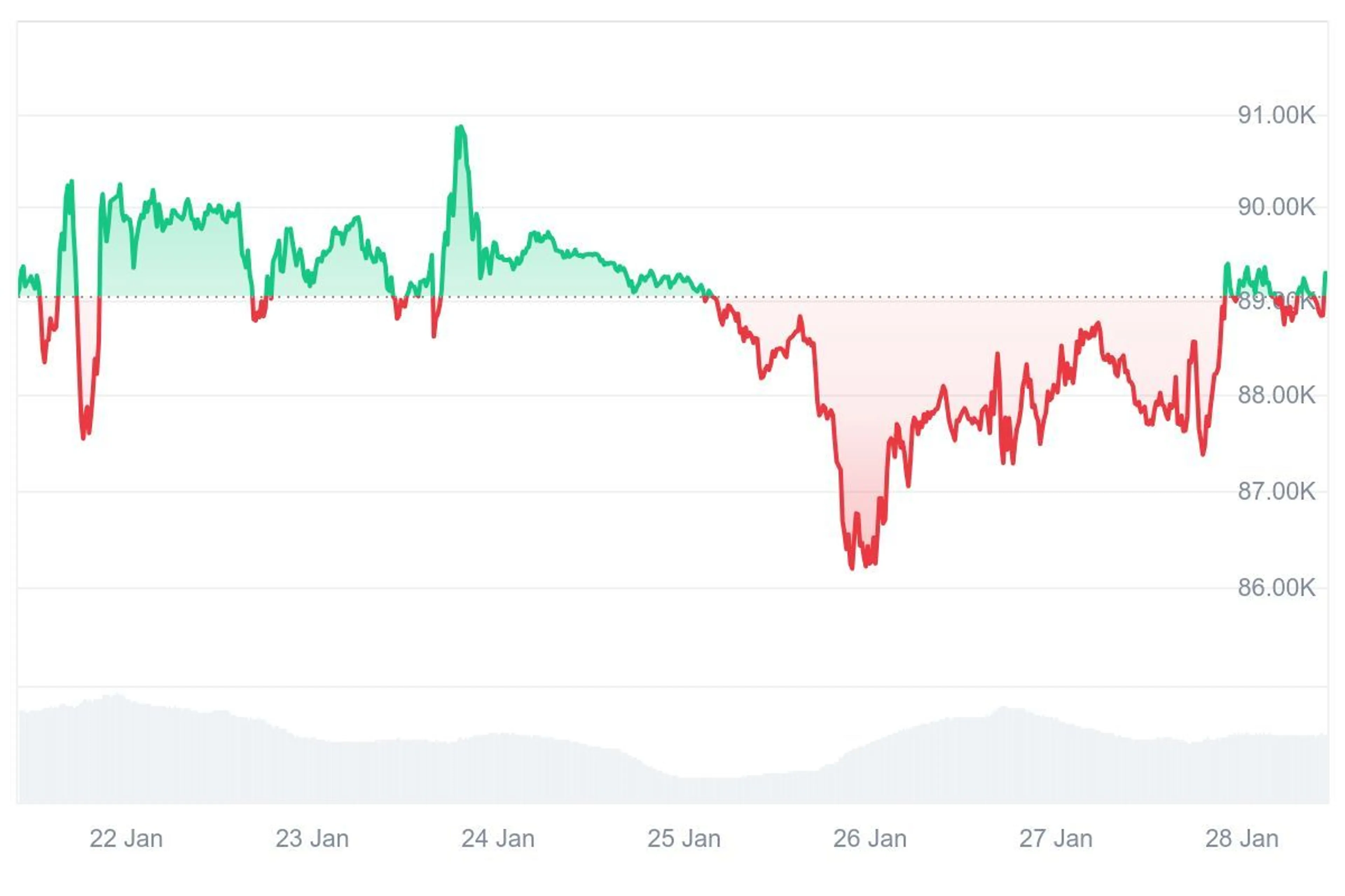 1. Bitcoin (BTC). На вечер среды, 28 января, курс биткоина зафиксировался на уровне $89200, продемонстрировав незначительное снижение за семь дней на 0,54%. График движения цены отчетливо демонстрирует V-образный разворот: после резкого провала в выходные к минимумам около $86000 актив сумел отыграть большую часть потерь, вернувшись в зону выше $89000. Несмотря на восстановление котировок, рыночная доля биткоина сократилась на 0,05 процентного пункта, составив 59,09%, что говорит о локальном перераспределении капитала в пользу альткоинов на отскоке рынка.