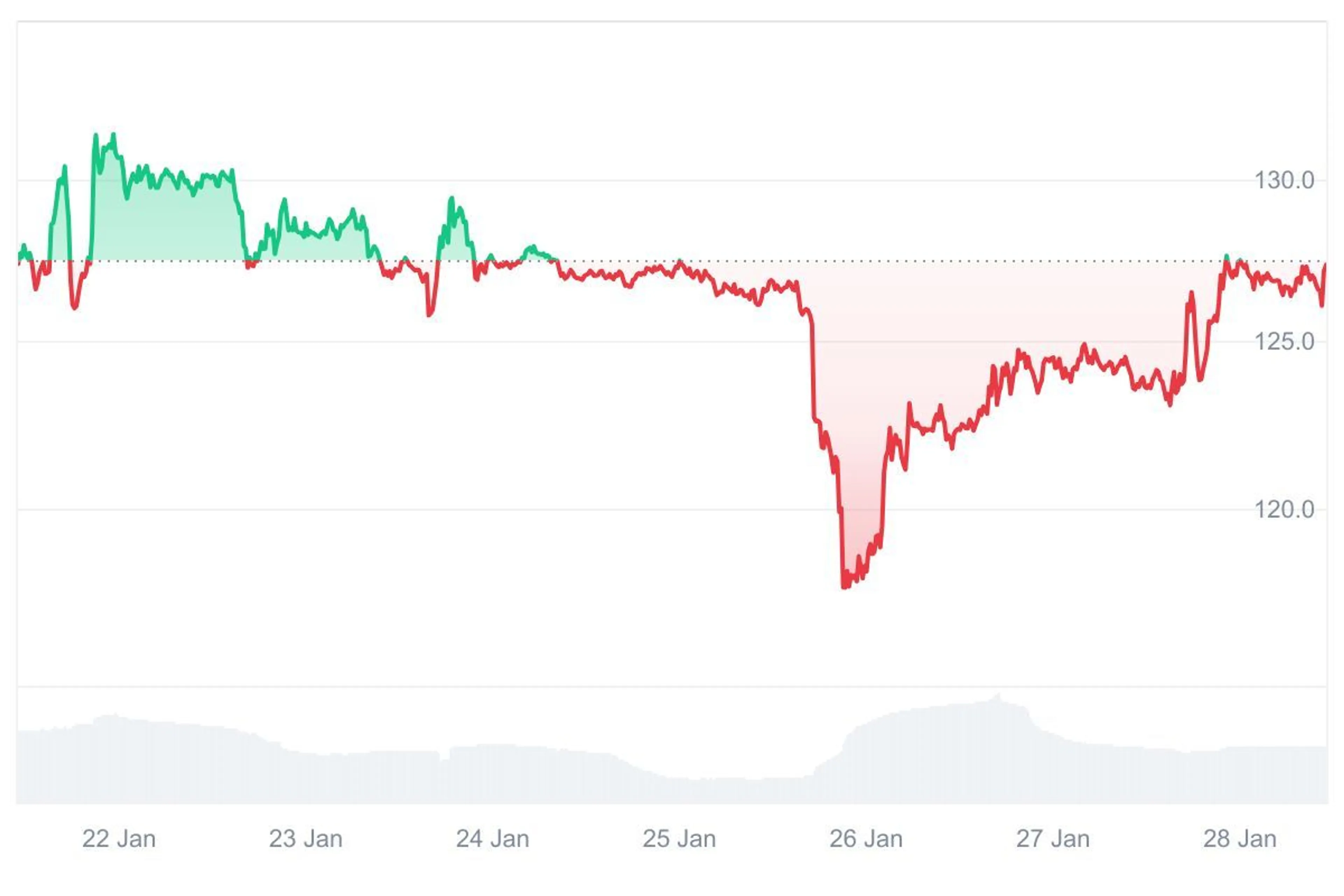 5. Solana (SOL). На вечер среды, 28 января, курс Solana остановился на отметке $127, показав рост стоимости за семь дней на 0,79%. График демонстрирует глубокую просадку ниже $118 в выходные дни, однако покупатели смогли полностью выкупить падение, вернув цену к значениям начала недели. Несмотря на рост котировок, рыночная доля SOL незначительно сократилась на 0,01 процентного пункта, составив 2,36%. Это указывает, что темпы восстановления капитализации актива немного отставали от общей динамики лидеров рынка.