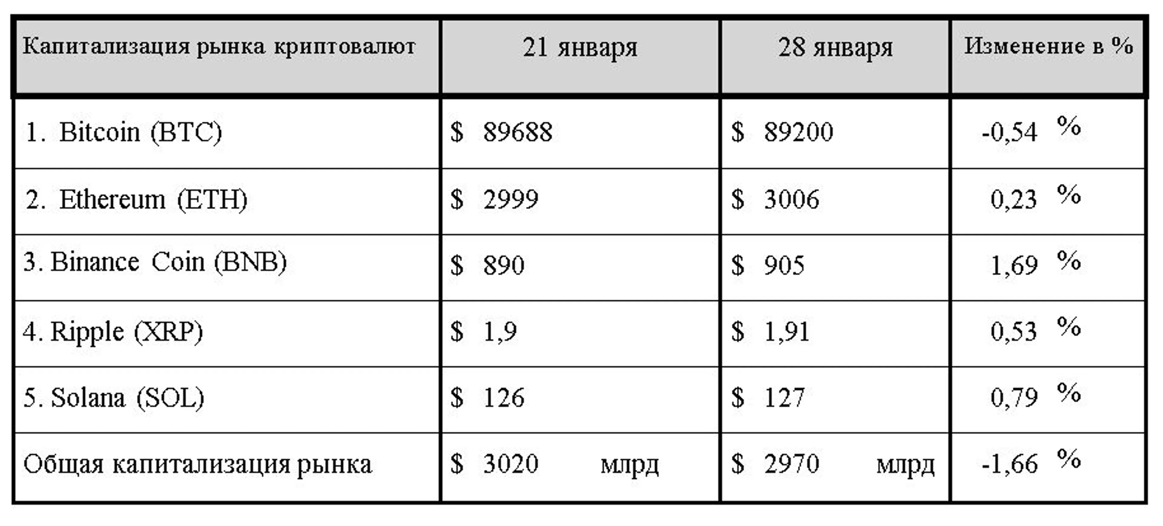 По итогам минувшего семидневного отчетного периода общая капитализация криптовалютного рынка упала ниже критически важной отметки в $3 трлн. На вечер среды, 28 января, показатель составил около $2,97 трлн, потеряв порядка 1,66% от значений на конец прошлого отчетного периода.