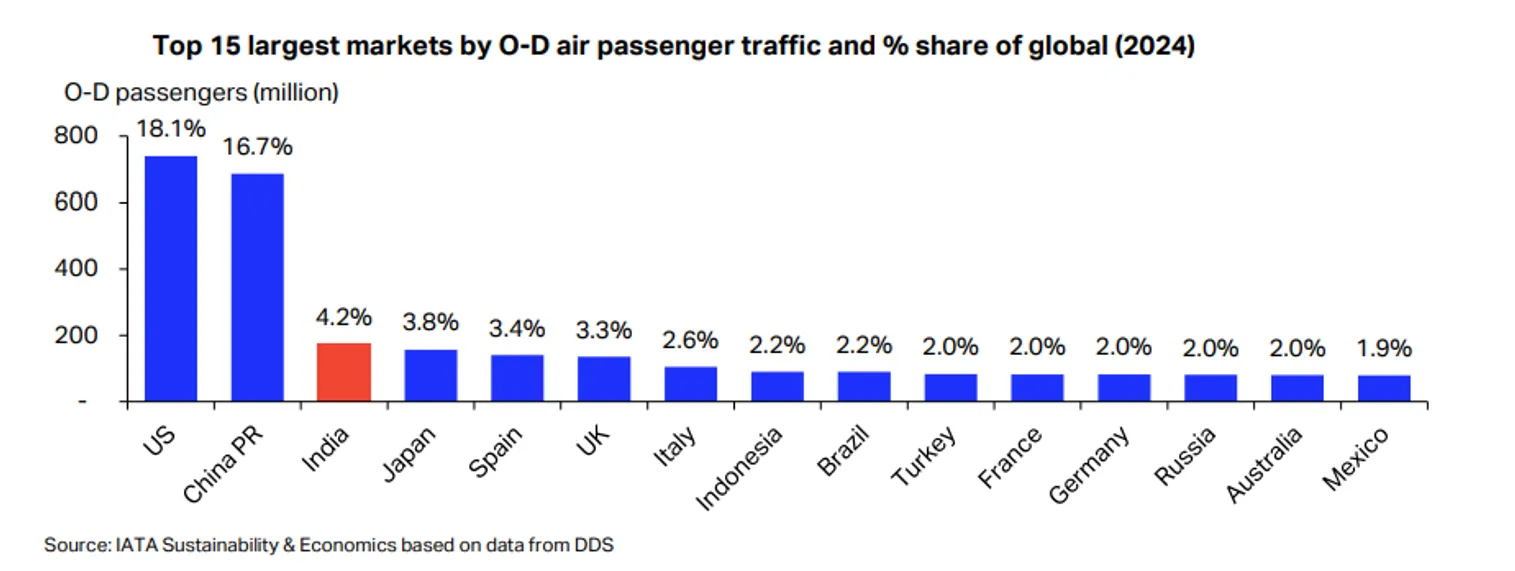 По данным Амитабха Хосла, в 2024 году пассажиропоток в Индии превзошел допандемийные показатели на 10,9%, а Индия заняла третье место в мире по числу вылетающих пассажиров, уступив только США и Китаю.