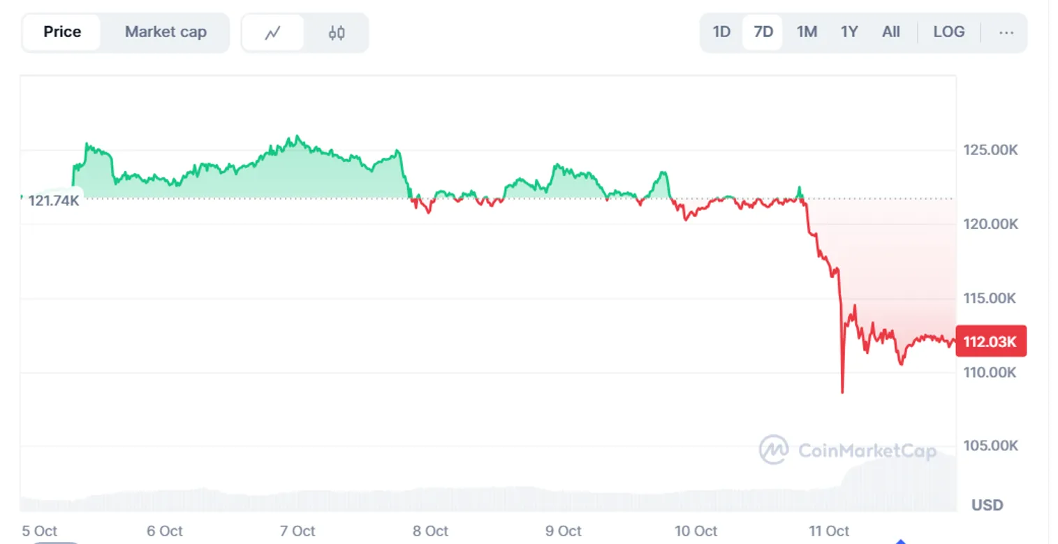 Стоимость Bitcoin продолжила падение в субботу — по данным на 22:41 по времени Астаны 11 октября, цена первой криптовалюты снизилась до 112 116,26 доллара, потеряв 4,94% за сутки. Снижение последовало за масштабной распродажей технологических бумаг и других рисковых активов на фоне обострения торговых отношений между США и Китаем, сообщает Investing.