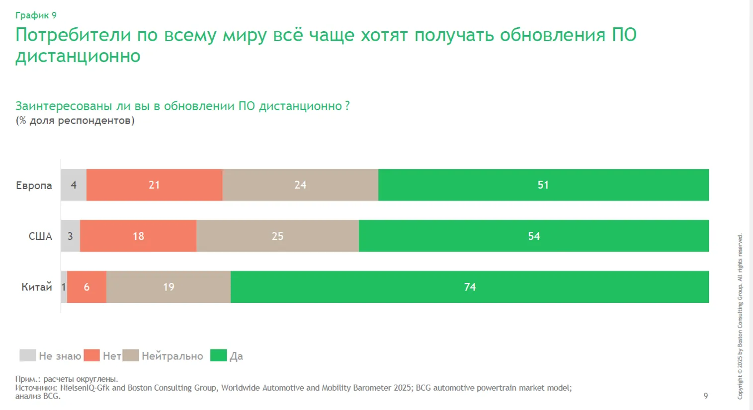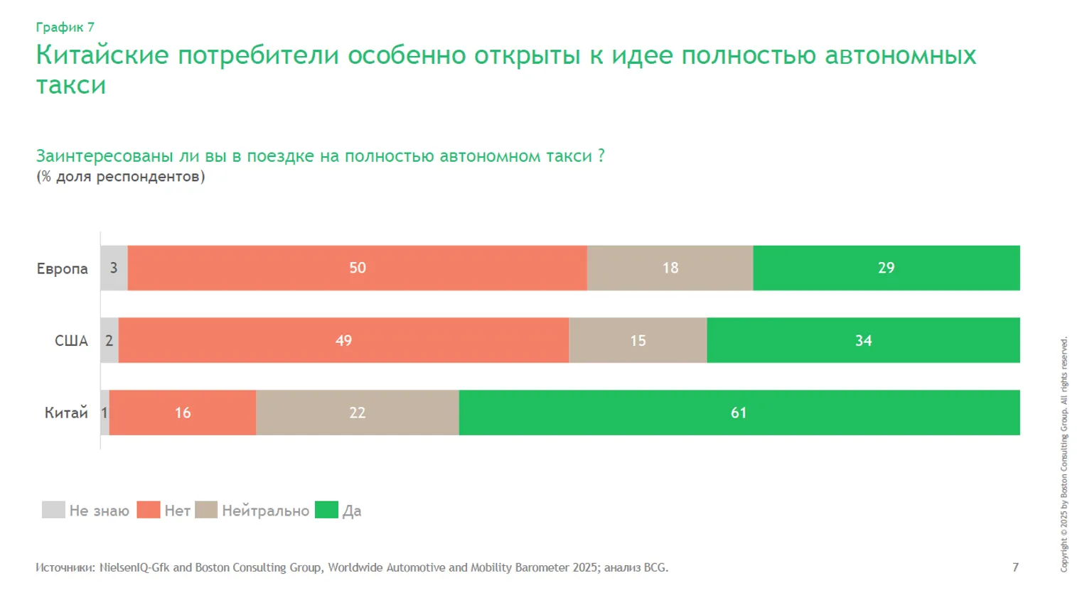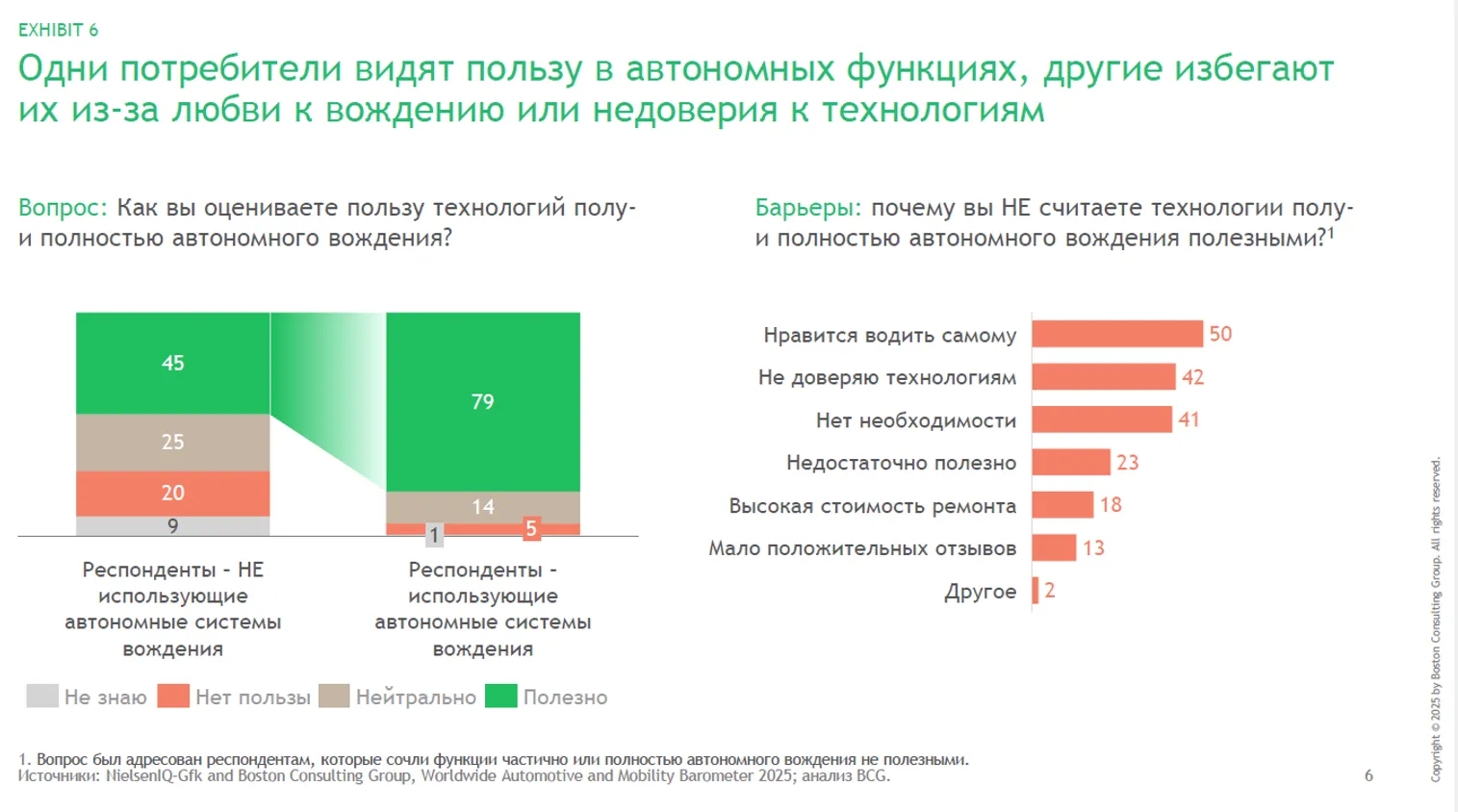 Автономные функции набирают популярность, но отношение к ним остается неоднозначным. 79% водителей, использующих полуавтоматические или высокоавтоматизированные функции, считают их полезными. Даже 45% тех, кто ими не пользуется, согласны с этим. Однако полная автономия вызывает противоречивые мнения: 61% китайских водителей готовы ездить на полностью беспилотных такси, а в США и Европе - 34% и 29% соответственно.