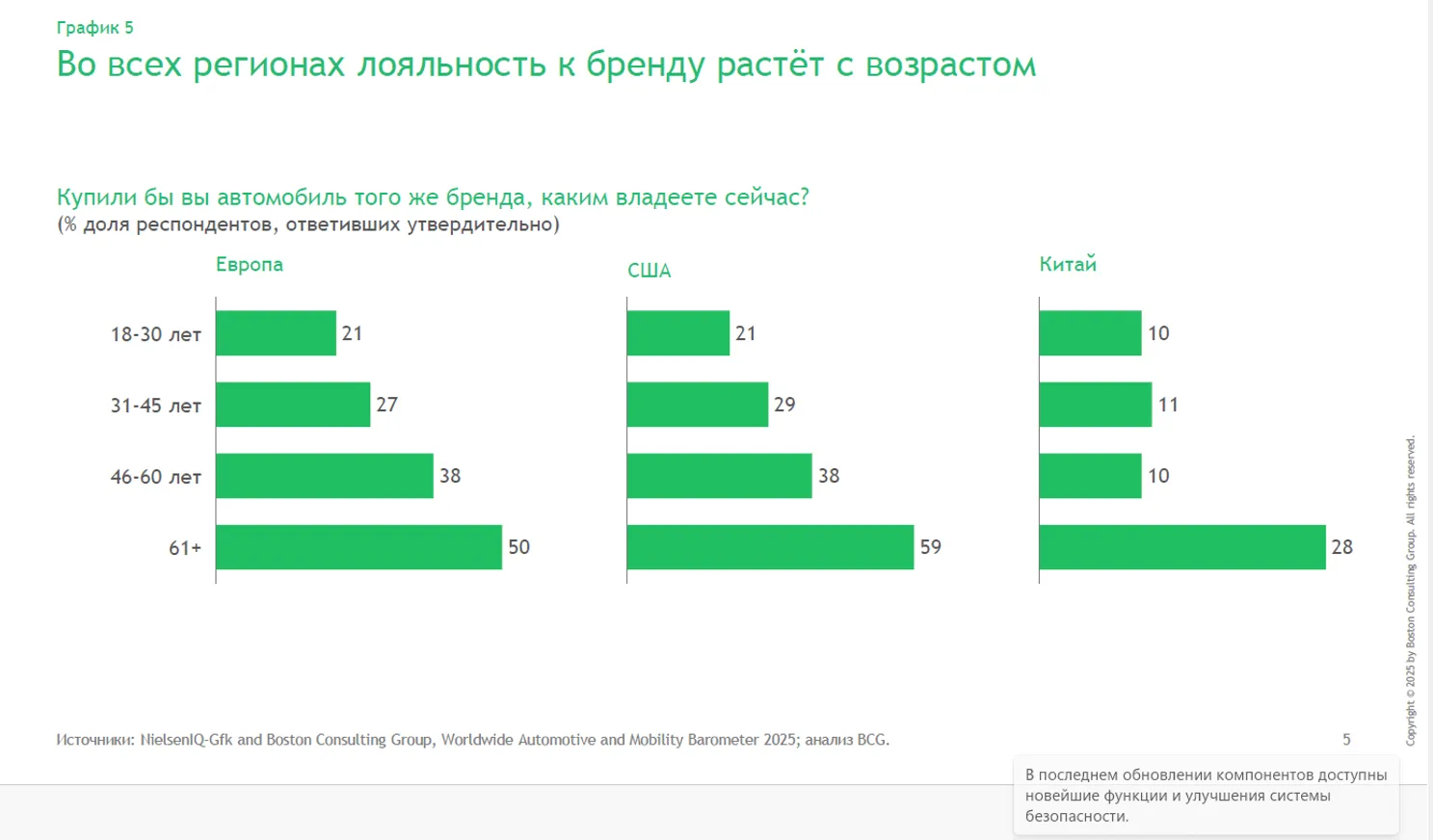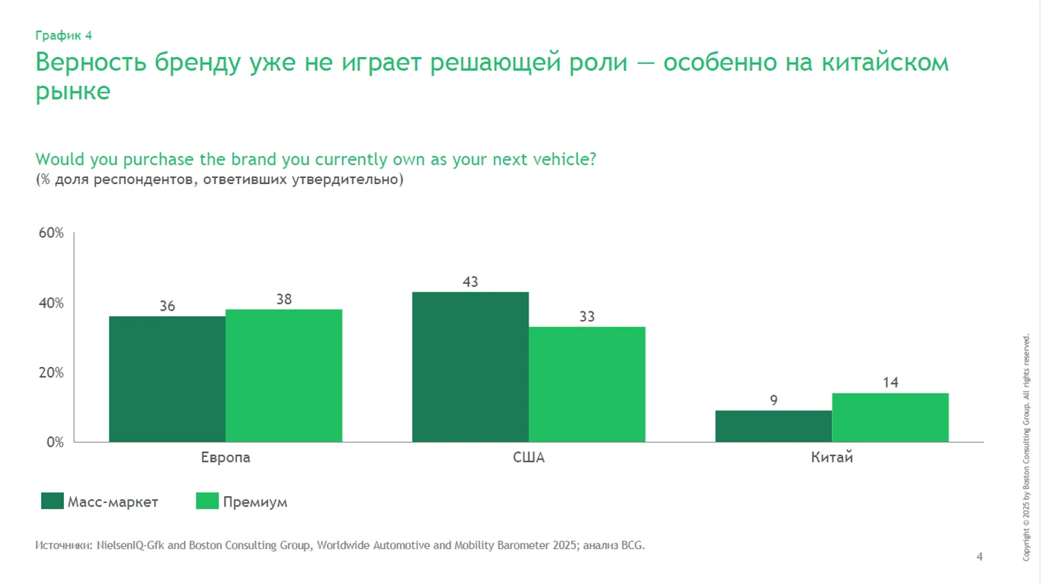 По мере снижения лояльности новые бренды, ориентированные на электромобили и на создание ценности, завоевывают долю рынка. Для автогигантов вывод очевиден: наследие бренда больше не гарантирует сохранность доли рынка — её предопределяют инновации и клиентский опыт.