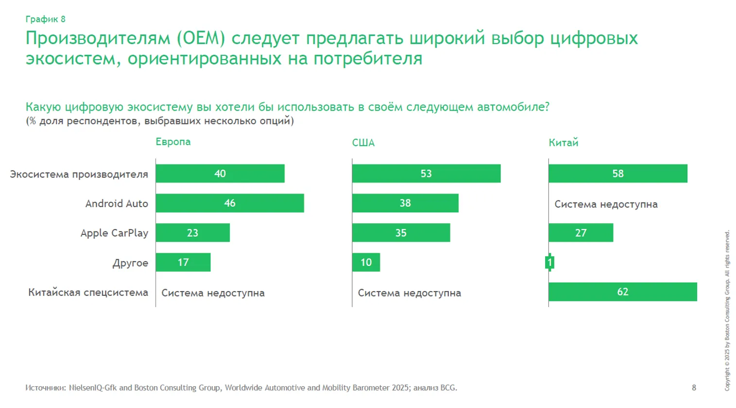 «Изменения идут по всем направлениям: меняются приоритеты потребителей, падает лояльность, китайские бренды выходят на рынок, а электромобили укрепляют позиции. Следующие пять лет заставят OEM-производителей переосмыслить свои подходы к производству и продажам. Бренды должны добиваться успеха, обеспечивая прозрачность, ценность и бесшовный цифровой опыт», — сказал Феликс Штелльмазек, глобальный руководитель экспертной практики BCG по автопрому и мобильности и один из авторов отчета.