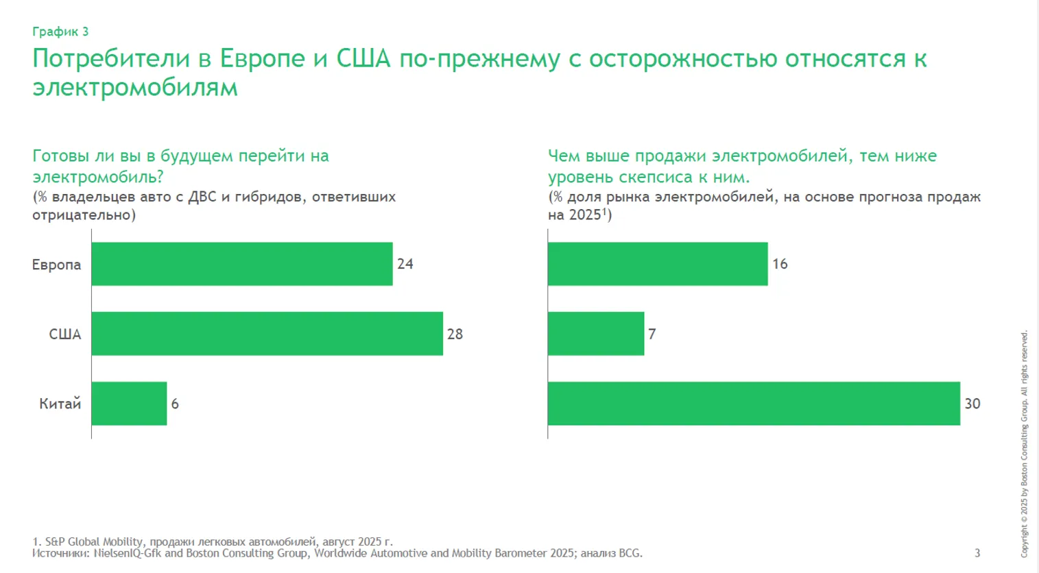 Во всем мире 71% владельцев электромобилей заявляют, что выберут его снова в следующий раз. Тем не менее значительная доля потребителей по-прежнему не спешит - 24% в Европе и 28% в США заявили, что никогда не перейдут на электромобиль. Большинство из них — люди старшего возраста. Например, в США доля таких респондентов среди людей в возрасте 61 года и старше составляет 39%, а среди молодёжи от 18 до 30 лет — лишь 10%.